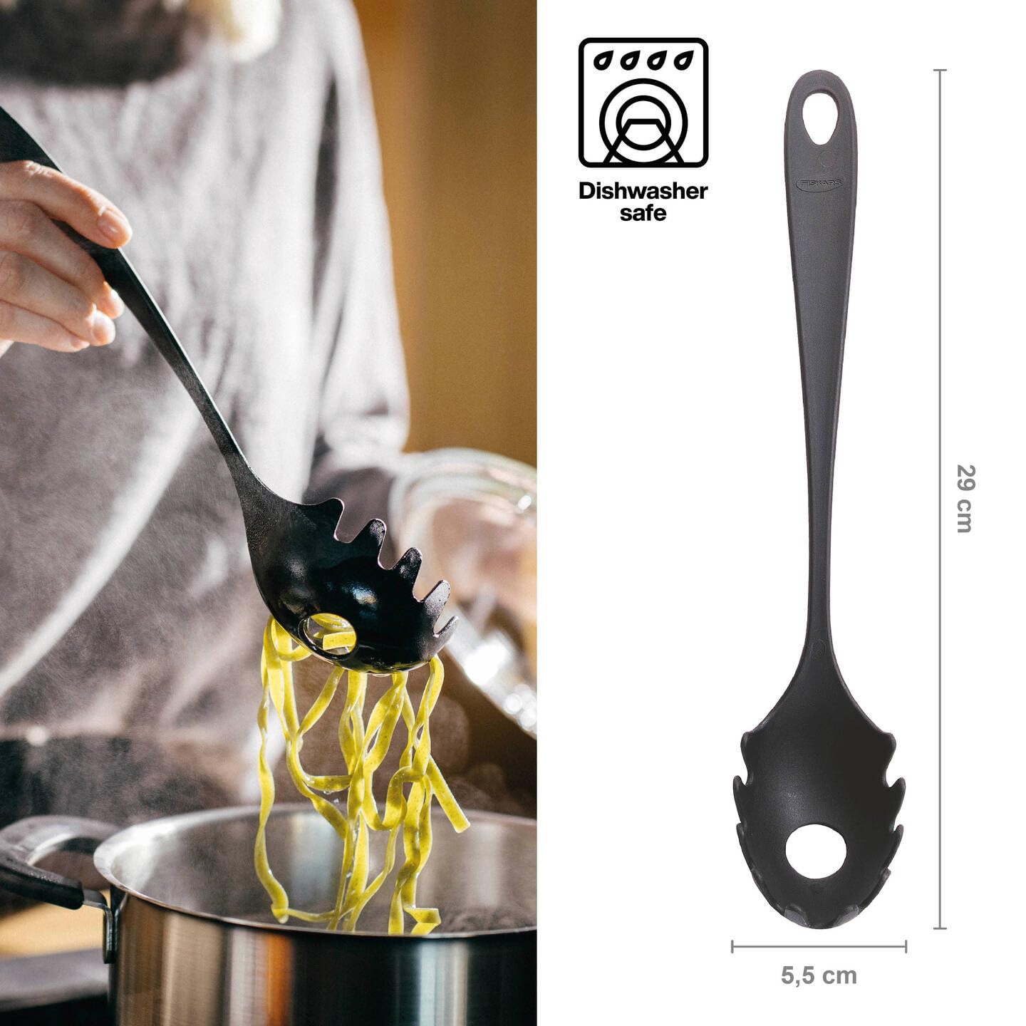 Leichter und handlicher Küchenhelfer zum Abmessen und Portionieren von Spaghetti sowie zum Servieren und Anrichten von Speisen - Einfaches Aufnehmen von Nudeln dank gezahnter Kelle, Loch in der Kellenmitte zum einfachen Abmessen von 2 Portionen Spaghetti, Kein Zerkratzen von Antihaftbeschichtungen durch Kunststoff - Hohe Sicherheit: Kein Verbrennen der Finger durch Verwendung von Kunststoff, Platzsparend verstaubar dank Aufhängemöglichkeit - Hohe Langlebigkeit, Spülmaschinenfest, Produktverpackung enthält 90% weniger Plastik im Vergleich zum Vorgängermodell - Lieferumfang: 1x Fiskars Pastalöffel, Essential, Länge: 28,5 cm, Gewicht: 38 g, Material: Kunststoff, Farbe: Schwarz, 1065593