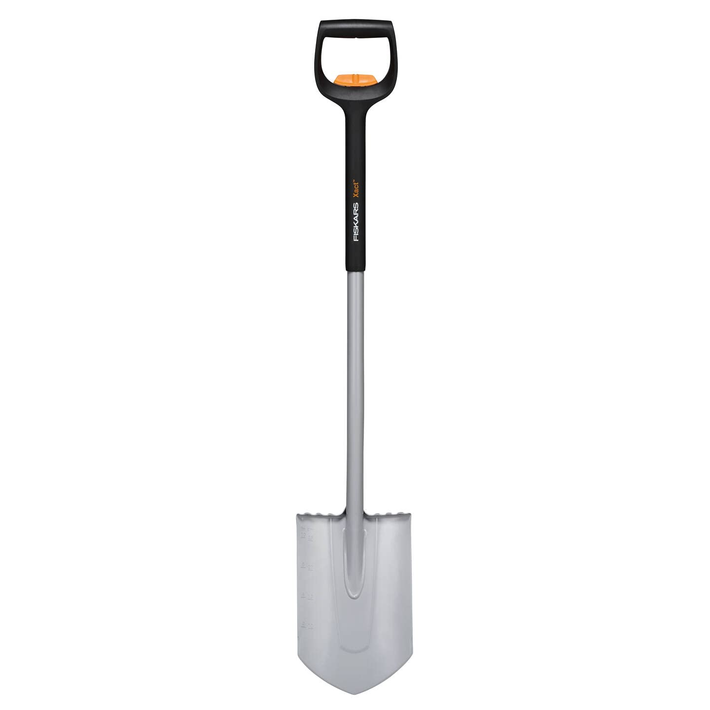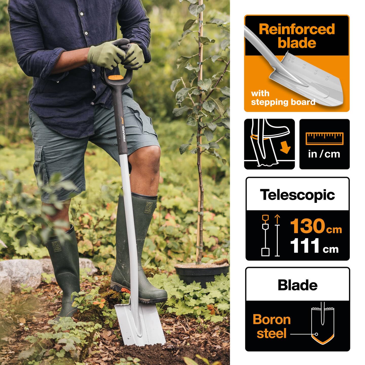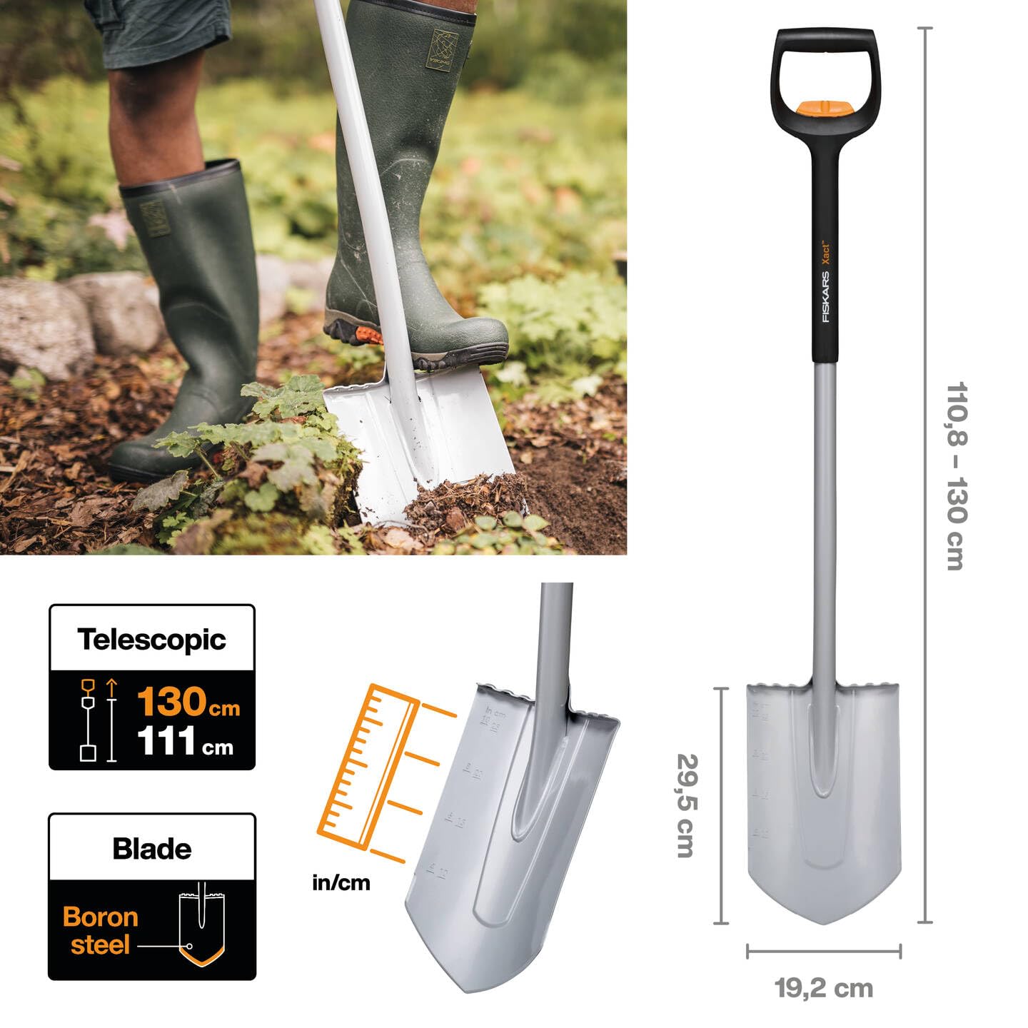 Spitzer Teleskop-Spaten für schwere, steinige Böden, Auch zum Wurzel- oder Rasenstechen, Optimale Arbeitshöhe durch teleskopierbaren Stiel (ca. 1,11-1,30 m) - Geschärfte Blattkante und Seite für ein leichtes Einstechen, Geschweisste Verbindung für Robustheit und Langlebigkeit - Verstärktes Blatt aus hochwertigem Borstahl, Verstärkungsrillen im Blatt inkl. Messskala für erhöhte Langlebigkeit - Ergonomischer Schaftwinkel mit SoftGrip-Oberfläche für eine optimale Arbeitsposition - Lieferumfang: 1x Fiskars Teleskop-Spaten für schwere, steinige Böden, Spitz, 111-130 cm, 1,68 kg, Verstärktes Borstahl-Blatt, Schwarz/Orange, Xact, 1066732