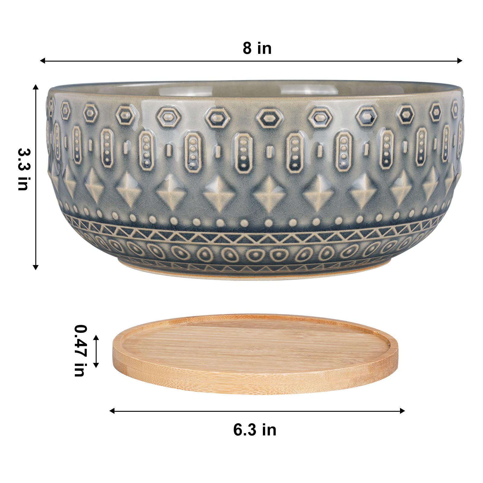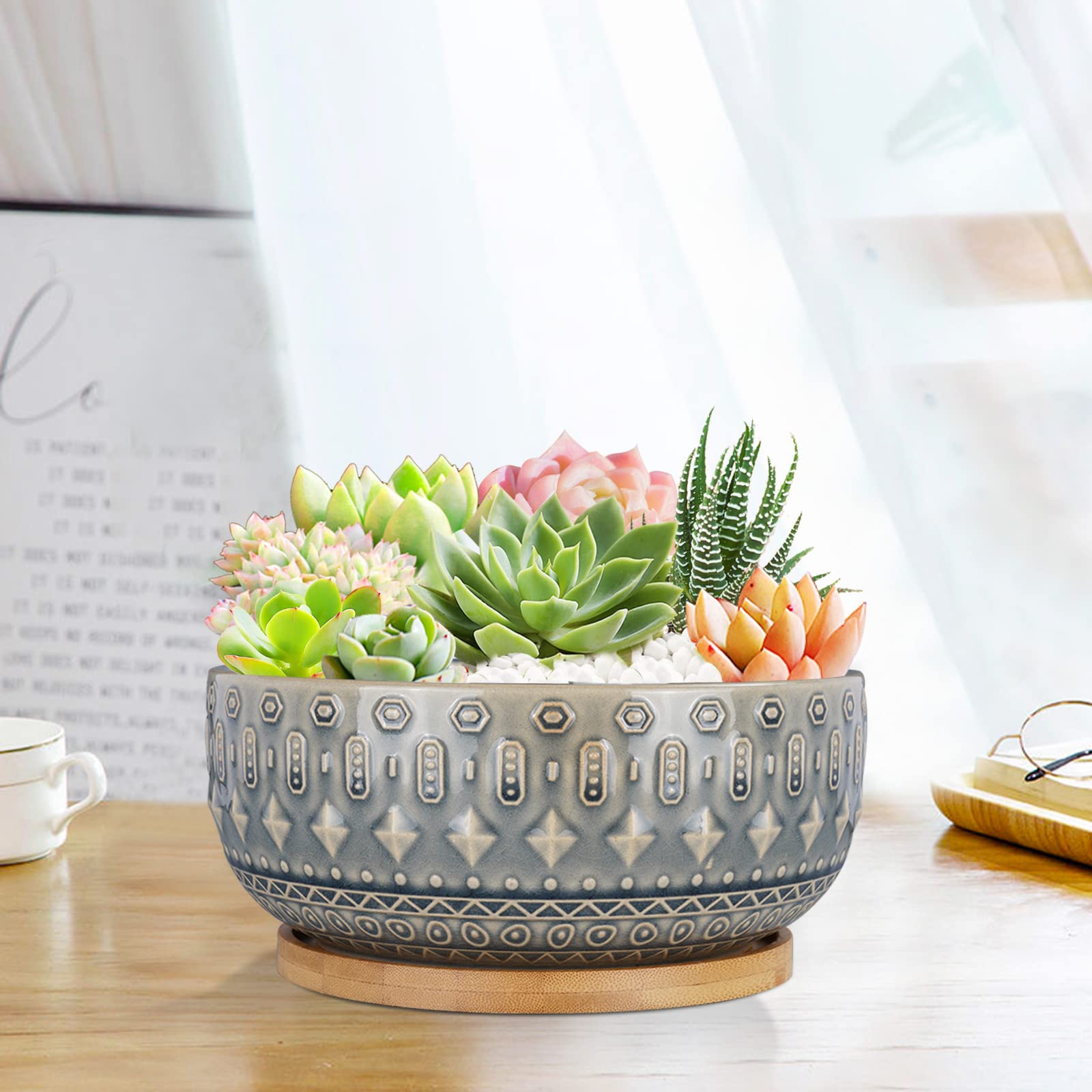 Fivepot 8 Zoll Keramik Sukkulenten Pflanztopf Töpfe mit Drainageloch Blumentopf für Zimmerpflanzen Rund Flach Bonsai Topf mit Bambustablett Blau