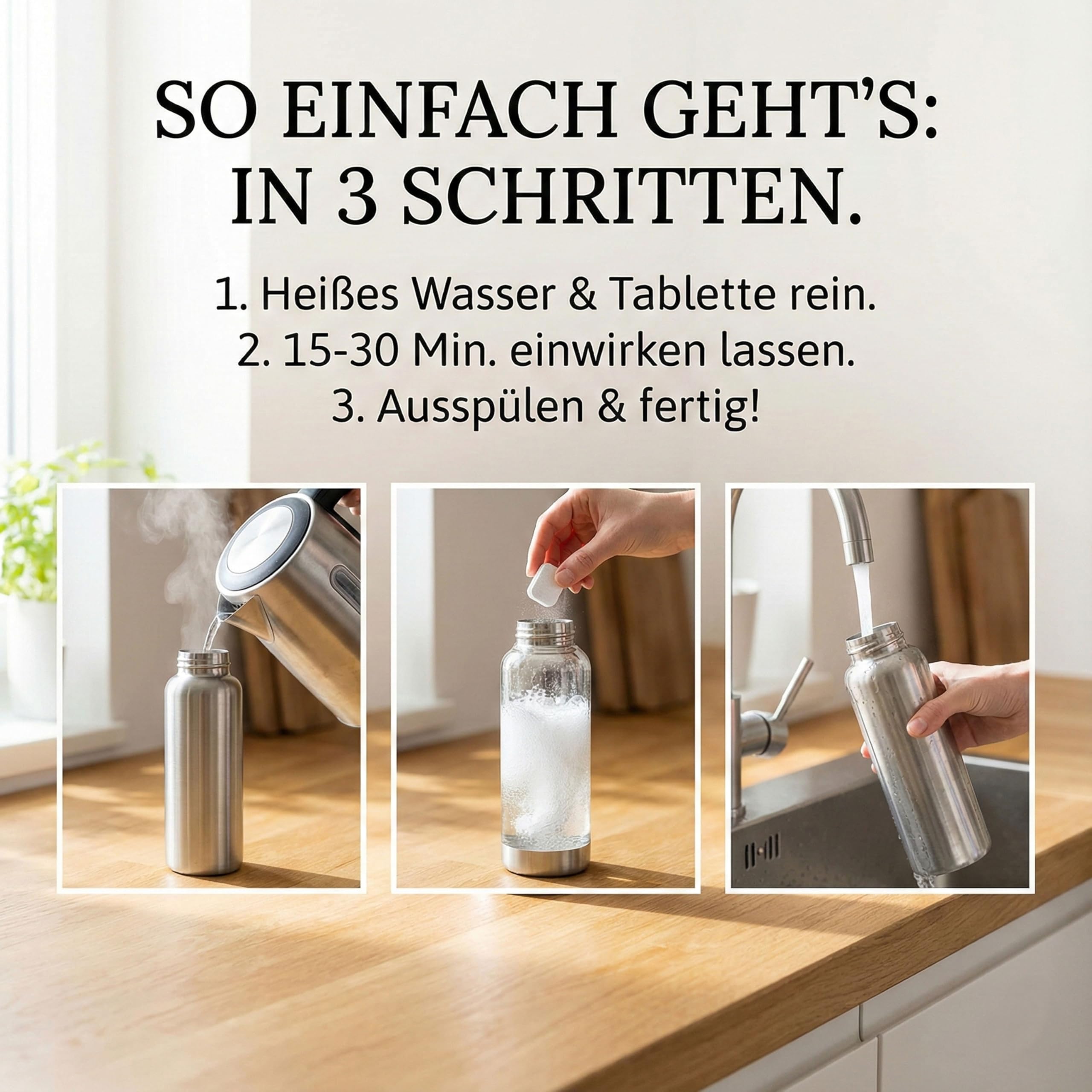 Wer kennt das nicht? Nach einer Weile riecht die Lieblingsflasche einfach ein wenig, auch wenn man sie immer pfleglich behandelt. Und selbst wenn sie nicht wirklich dreckig ist, setzen sich gerne Rückstände ab. Dafür und für weitaus schlimmere Verschmutzungsarten haben wir die aquabook Reinigungstabletten entwickelt. Sie beseitigen schon nach einer kurzen Einwirkzeit von 30 Minuten nicht nur Schmutz, sondern auch Gerüche! Und das absolut umweltfreundlich: Unsere Tabletten sind biologisch abbaubar und enthalten keine Phosphate oder andere scharfe Chemikalien. Für das "Wie neu-Gefühl" Die aquabook Flaschenreiniger schaffen, was selbst die Spülmaschine nicht kann: eine gründliche Reinigung von innen. Gerüche und Rückstände – egal ob Tee, Kaffee oder andere hartnäckige Verschmutzungen – verschwinden im Handumdrehen. Der Wirkstoff der Reinigungstabletten: Aktivsauerstoff. Für alle Behälter Die Tabletten sind perfekt auf die Füllmenge der durchschnittlichen Trinkflasche abgestimmt. Das heisst: pro 750 ml eine Reinigungstablette. Sie sind für alle Flaschen und Behälter verwendbar und für alle Materialien – wie Aluminium, Edelstahl, Kunststoff, Plastik und Glas – geeignet. Spielend leichte Anwendung Eine aquabook Cleaning Tab aus dem Blister drücken und in den zu reinigenden Behälter geben. Mit warmem Wasser auffüllen, 30 Minuten einwirken lassen. Ausspülen – fertig! Ihre optimale Wirkung entfalten die Tabletten bei warmem, nicht kochendem Wasser. Die Einwirkzeit kann je nach Verschmutzungsgrad beliebig verlängert werden. Inhaltsstoffe: Pentakalium bis (peroxymonosulphate) bis (sulfate) (70693-62-8) Subtilisin (9014-01-1) Enthält Subtilisin.