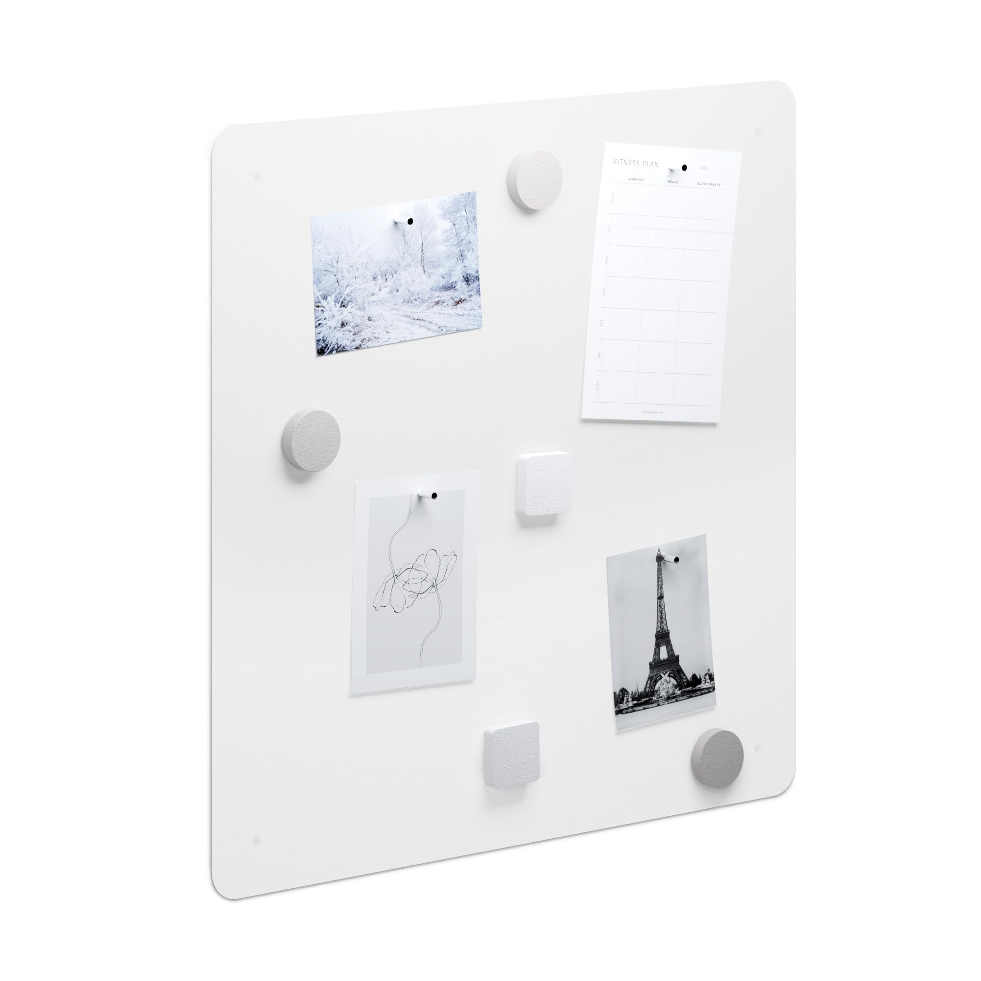 Flatbo Magnettafel aus Metall, 50 x 50 cm, Tafel für Postkarten, Urlaubssouvenirs oder Notizen. Inklusive 4 Magnete und Montageset.