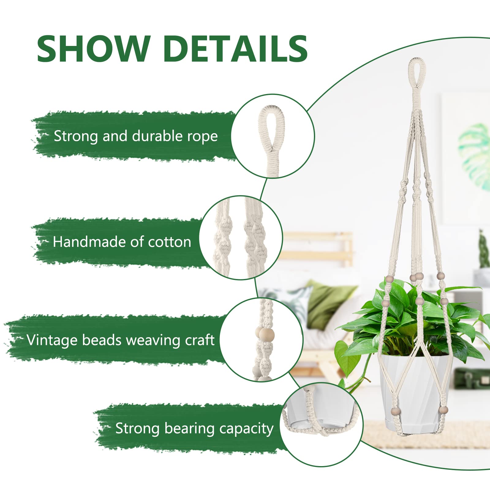 Flintronic Makramee Blumenampel, Baumwollseil Hängeampel Hängetopf für Pflanzen mit Metallhaken für Innen, Garten, Wohnzimmer,Aussen, Balkon, Fenster, Balkone WanddekorationMerkmale:- Metallhaken sind robust und langlebig für die Sicherheit- Vintage und elegantes Dekor ergänzen dieses warme und schöne Zuhause- Geeignet zum Aufhängen von Zimmerpflanzen, Sukkulenten, Blumen- Schöner und zeitloser Boho-Stil passt hervorragend zu jedem modernen oder traditionellen Stil.- Einzigartiges hängendes Design, hält Pflanzen von Haustieren fern, macht Ihr Dekor sicherer, wärmer und optisch interessantMaterial: natürliches BaumwollseilGrösse:89CM/35.04in105CM/41.34in2*80CM/31.5in+2*100CM/39.37inDas Paket beinhaltet:PflanzenaufhängerFörmiger MetallhakenZufriedener Service:Wir sind bestrebt, unseren Kunden das beste Einkaufserlebnis zu bieten. Wenn Sie Fragen zu unseren Produkten haben, können Sie uns per E-Mail kontaktieren. Wir bemühen uns um Ihre 100%ige Zufriedenheit.