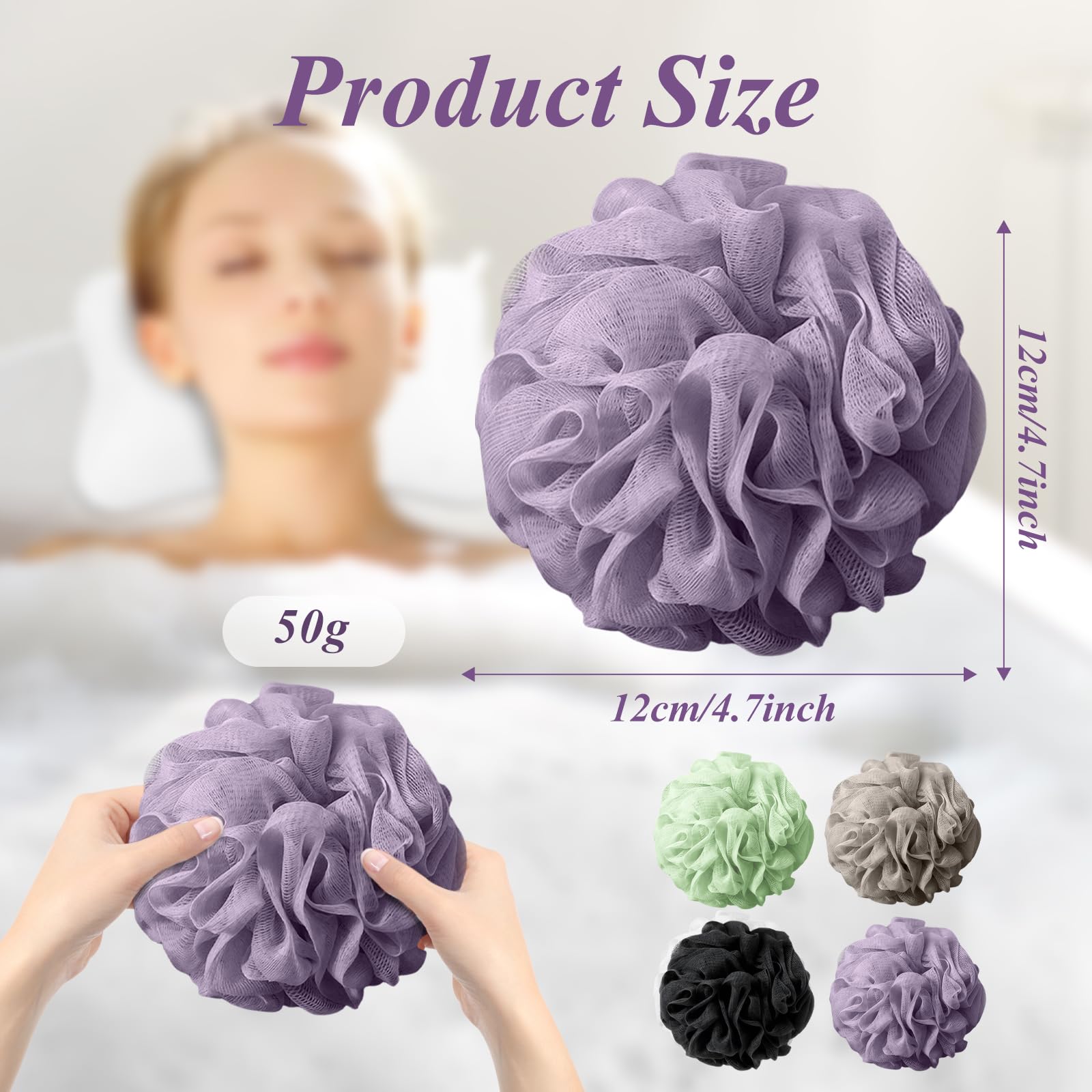 flintronic 4 Stück Badeschwamm, 60g Dusch-Luffa-Kugeln, Masche Schäumend Duschschwamm Körper, Extra Groß, Einfach Schäumend, für Reinigendes Körperpeeling&Peeling (Lila + Hellgrün + Grau + Schwarz)