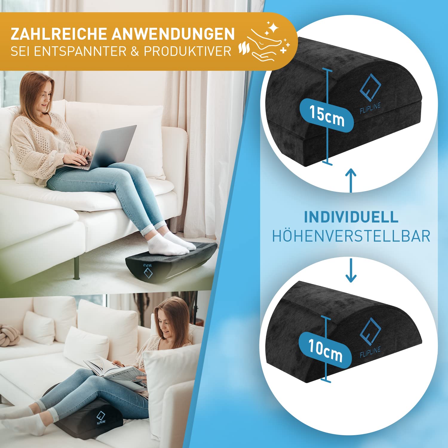 FLIPLINE Fussstütze Schreibtisch - Höhenverstellbare Fussbank [rutschfest] - mit Flauschfaser Fusstasche - für Schreibtisch Büro Homeoffice Zubehör - Fusskissen Footrest Fusshocker
