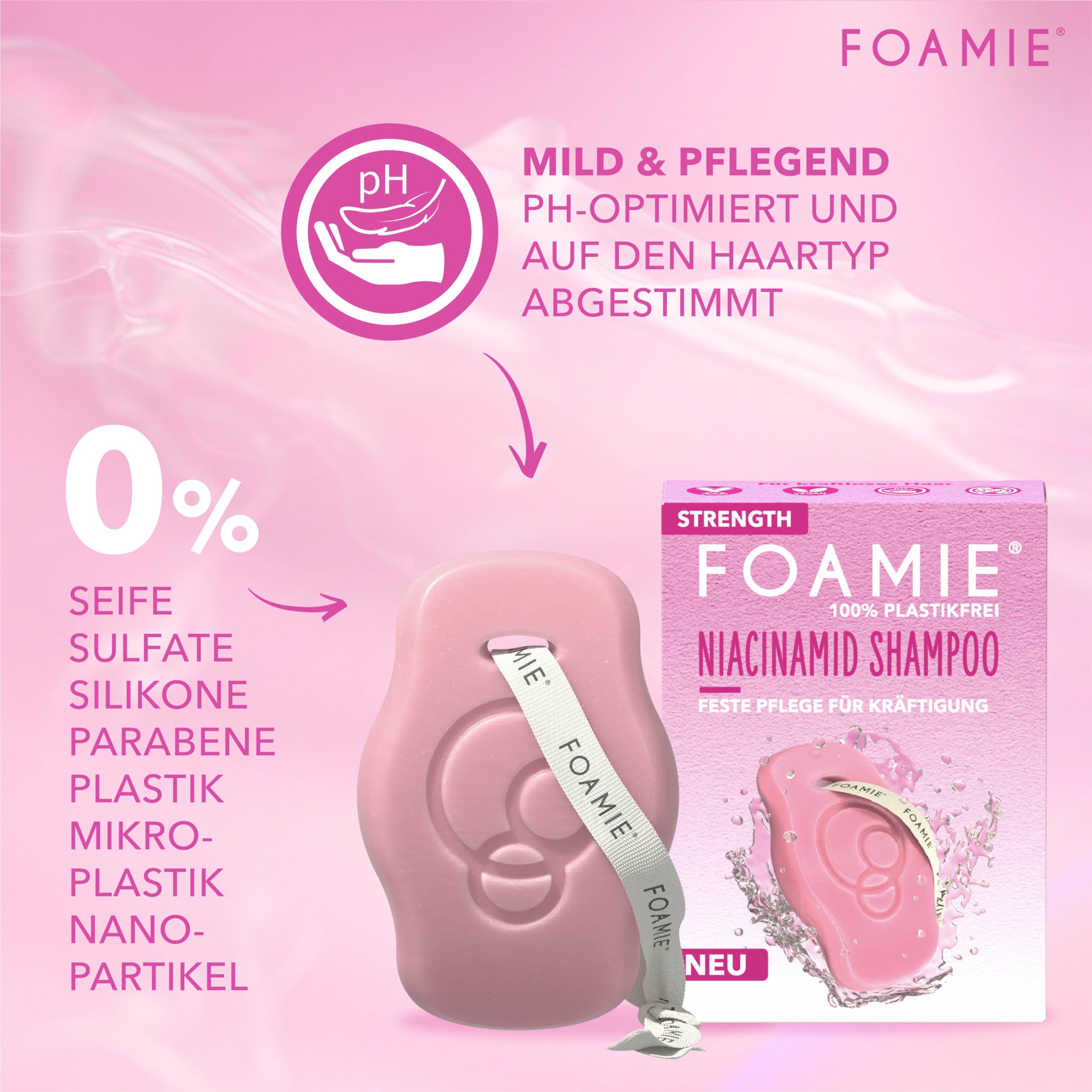 Foamie Festes Shampoo STRENGTH mit Niacinamid, Shampoo Volumen für Feines & Dünnes Haar, Niacin & Reisextrakte für intensiven Schutz & Kräftigung, 80g