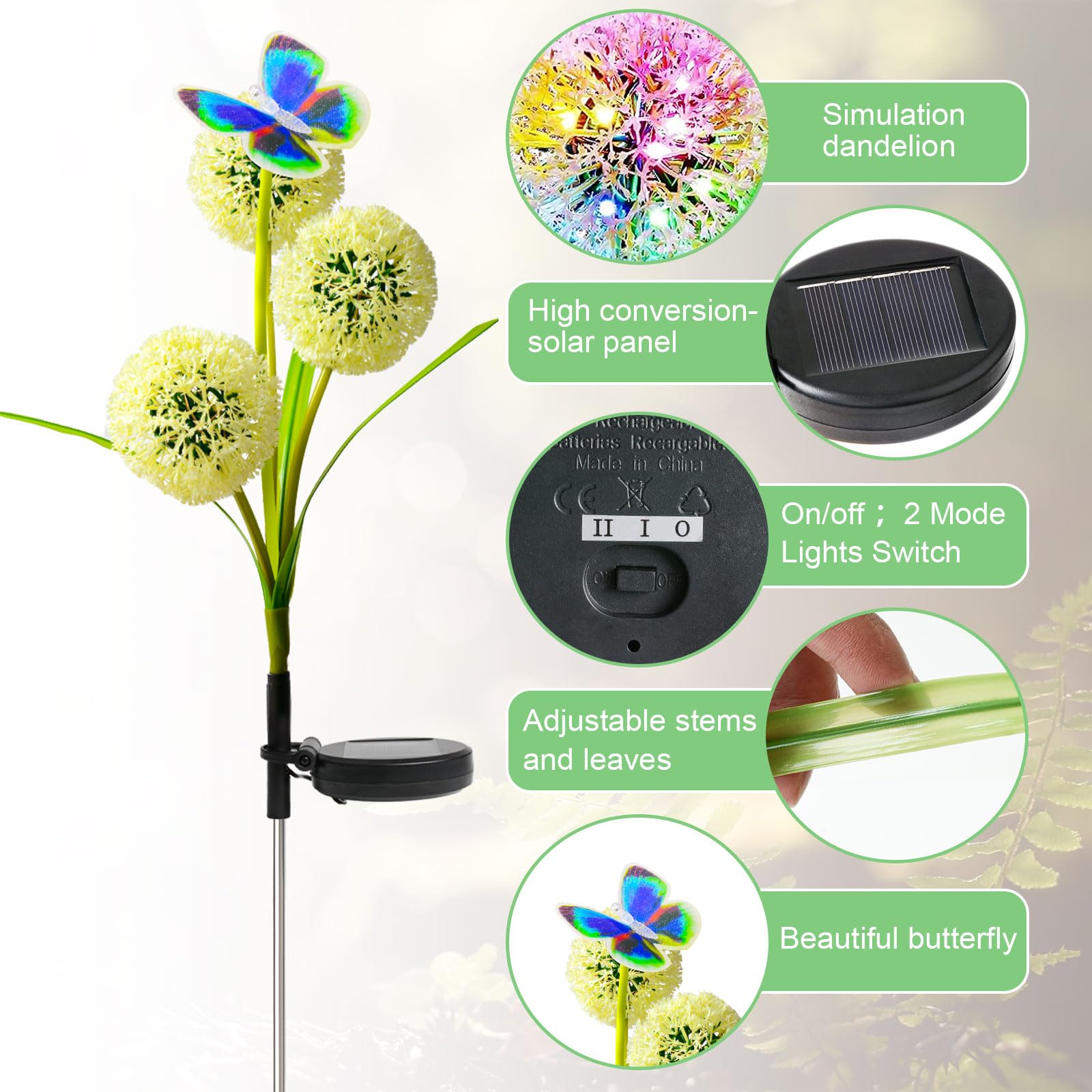 Löwenzahn-SolarleuchtenDandelion-Solarleuchten verwenden hochwertigen flexiblen Kupferdraht und farbige LED-Leuchten. Diese dekorativen Solarleuchten für den Aussenbereich mit 2 Beleuchtungsmodi (konstantes Licht und Funkeln) können Ihren unterschiedlichen Bedürfnissen gerecht werden. Verbessertes Solarpanel Die Solarleuchten für den Garten von Fohil sind mit dem grössten und hochwertigsten monokristallinen Solarpanel ausgestattet, dessen Konversionsrate bis zu 25% beträgt und damit effizienter ist als andere Solarleuchten. Solar-Gartenleuchten sind hochwertige eingebaute wiederaufladbare Batterien (1,2 V/600 mAh). Die Gartendekoration kann nach dem vollständigen Aufladen bis zu 12 Stunden lang eingeschaltet werden, was länger funktioniert als bei anderen Solarleuchten. IP65 wasserdichte Solar-Aussenleuchten sind wasserdicht und Sie müssen sich keine Sorgen um Regen, Schnee, Frost oder Schneeregen machen. Durch die Edelstahlpfähle und die robuste ABS-Kunststoffkonstruktion bieten diese Solar-Terrassenleuchten eine bessere Stabilität und Festigkeit. Aussenleuchten eignen sich perfekt als Gartendekoration oder Terrassendekoration, um Ihre Terrasse, Ihren Weg, Ihre Terrasse, Ihren Rasen, Ihren Hinterhof zu dekorieren. Einfach zu installieren und automatisches Ein-/Ausschalten. Es sind keine Kabel oder zusätzliche Werkzeuge erforderlich. Diese wasserdichten Solar-Gartenleuchten können in wenigen Sekunden einfach am Boden installiert werden und sind in kürzester Zeit bereit, die Nacht zu beleuchten. Diese Solarleuchten für den Aussenbereich schalten sich nachts automatisch ein und im Morgengrauen aus.