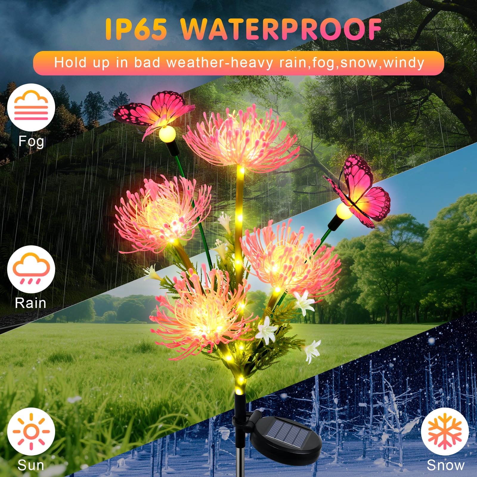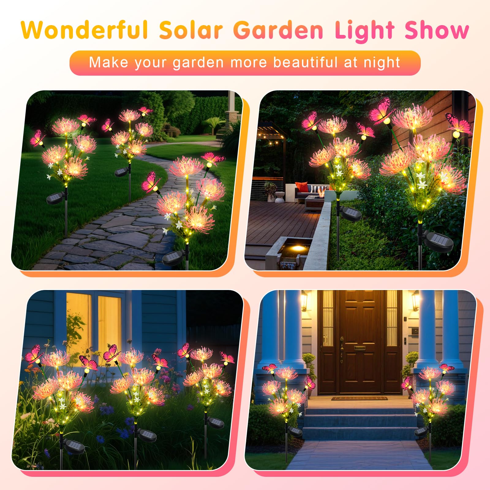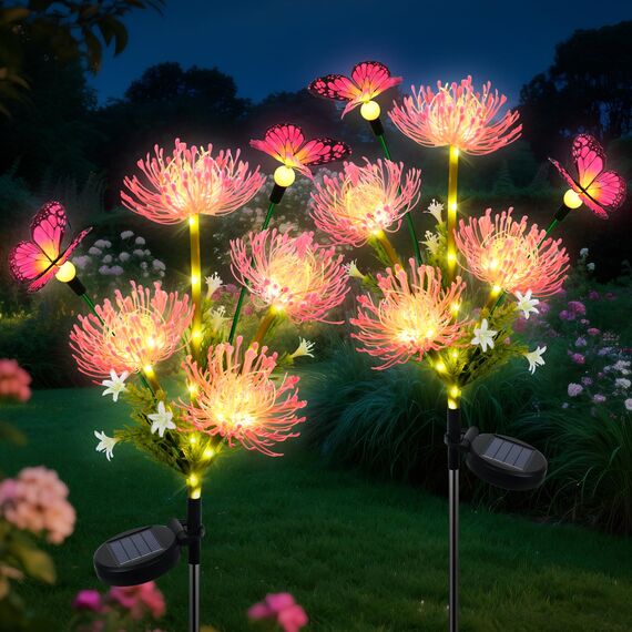 - 【Einzigartige Form, romantische Atmosphäre】Dieses solarleuchten für aussen garten ist sorgfältig mit vier lebensechten Blumen und zwei schicken Schmetterlingen gestaltet und verleiht Ihrem Garten, Rasengarten, Poolrand und Campingplatz eine romantische und fantasievolle Atmosphäre. Ganz gleich, ob es sich um eine Weihnachtsdekoration oder eine alltägliche Ergänzung handelt, es kann die Schönheit Ihres Raums hervorheben.