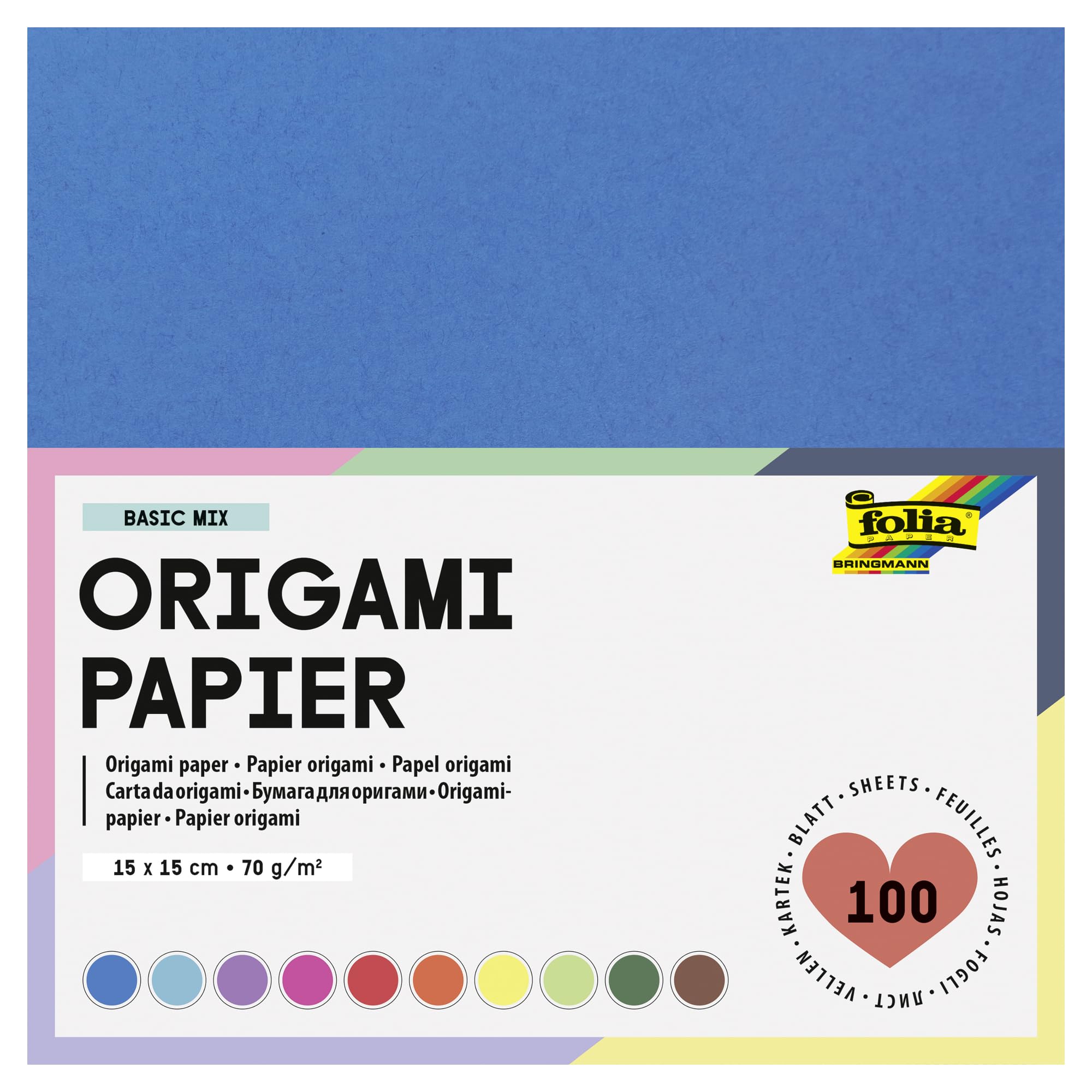 folia 8915 - Faltblätter 15 x 15 cm, 70 g/qm, 100 Blatt sortiert in 10 intensiven Farben - ideal zum Papierfalten und für andere kreative Bastelarbeiten