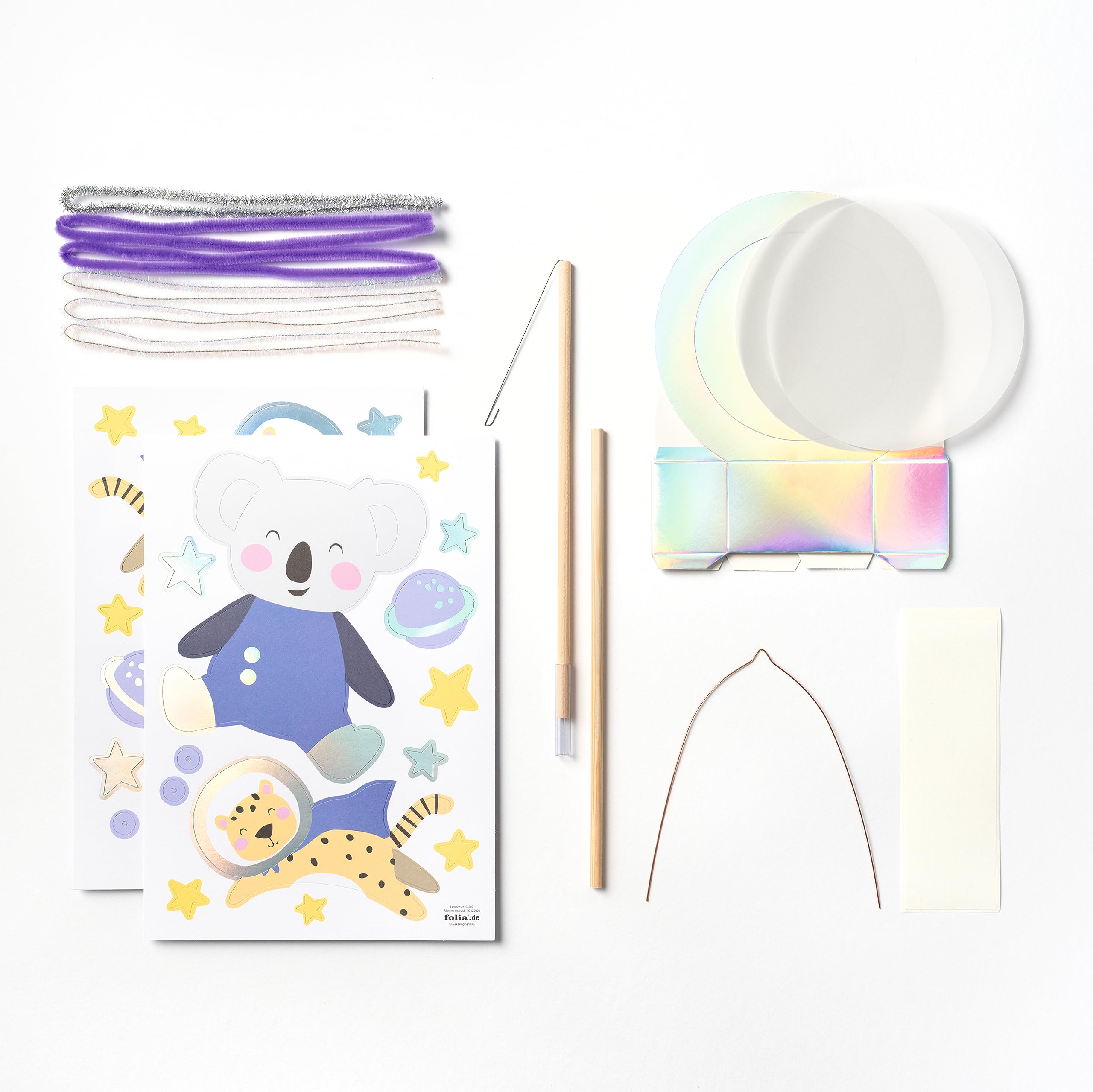 Mit dem Laternenbastelset SPACE SAFARI von Folia, können Sie mit Ihren Kindern eine schöne Laterne für Sankt Martinszüge, Kinderfeste, Halloweenpartys oder auch als Raumdekoration und Blickfang basteln. Die fertige Laterne ist ca. 23 x 33 x 10 cm gross. Enthalten ist ein Laternenrohling in Metallic Irisierend mit Transparentpapier-Zuschnitten, um der Laterne ein kosmisches Grundgerüst zu verleihen. Die beiliegenden Stanzbögen sind 4/4-farbig bedruckt und mit Veredelungselementen versehen, die hübsch glänzen. Zusätzlich gibt es Chenilledraht, um dem Lampion ein galaktisches Aussehen zu spendieren. Aus den enthaltenen Materialien können Sie eines der zwei Motive Koala oder Tiger basteln, oder eine ganz eigne Kreation entwerfen. Die übrigen Bestandteile können für andere kreative Projekte verwendet werden.