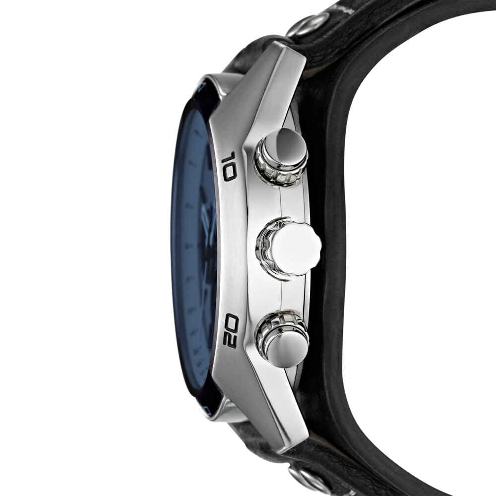 Ein trendiger Eyecatcher fürs Handgelenk ist dieser EdelstahlChronograph mit Lederband Nieten halten das mattglänzende Gehäuse auf dem doppelten, schwarzen Lederband Der Gehäuserand ist verspiegelt Das silbermetallic schimmernde Zifferblatt hat schwarz umrandetete ChronoAuGen auf 9, 6 und 3 Uhr und einen weissen Tachymeterring Das Mineralglas ist blau gefärbt