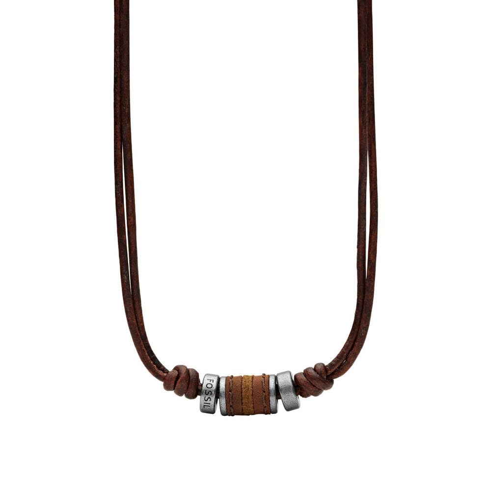 Bei dieser Herrenkette wurden verschiedene Rondeln auf eine braune Lederschnur gefädelt.