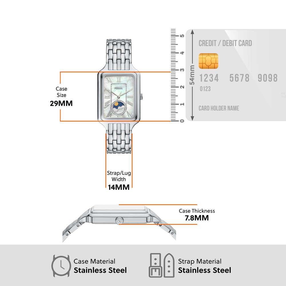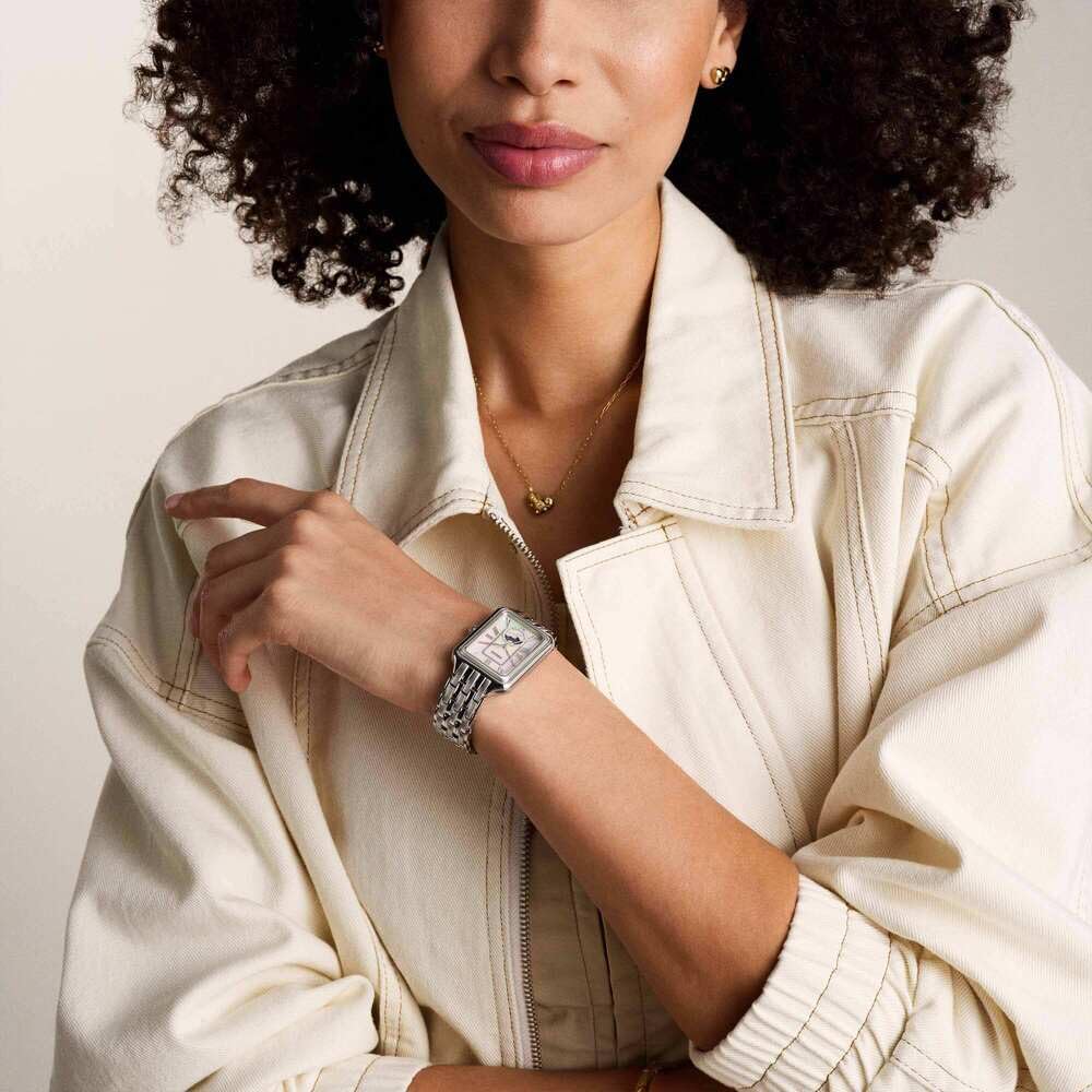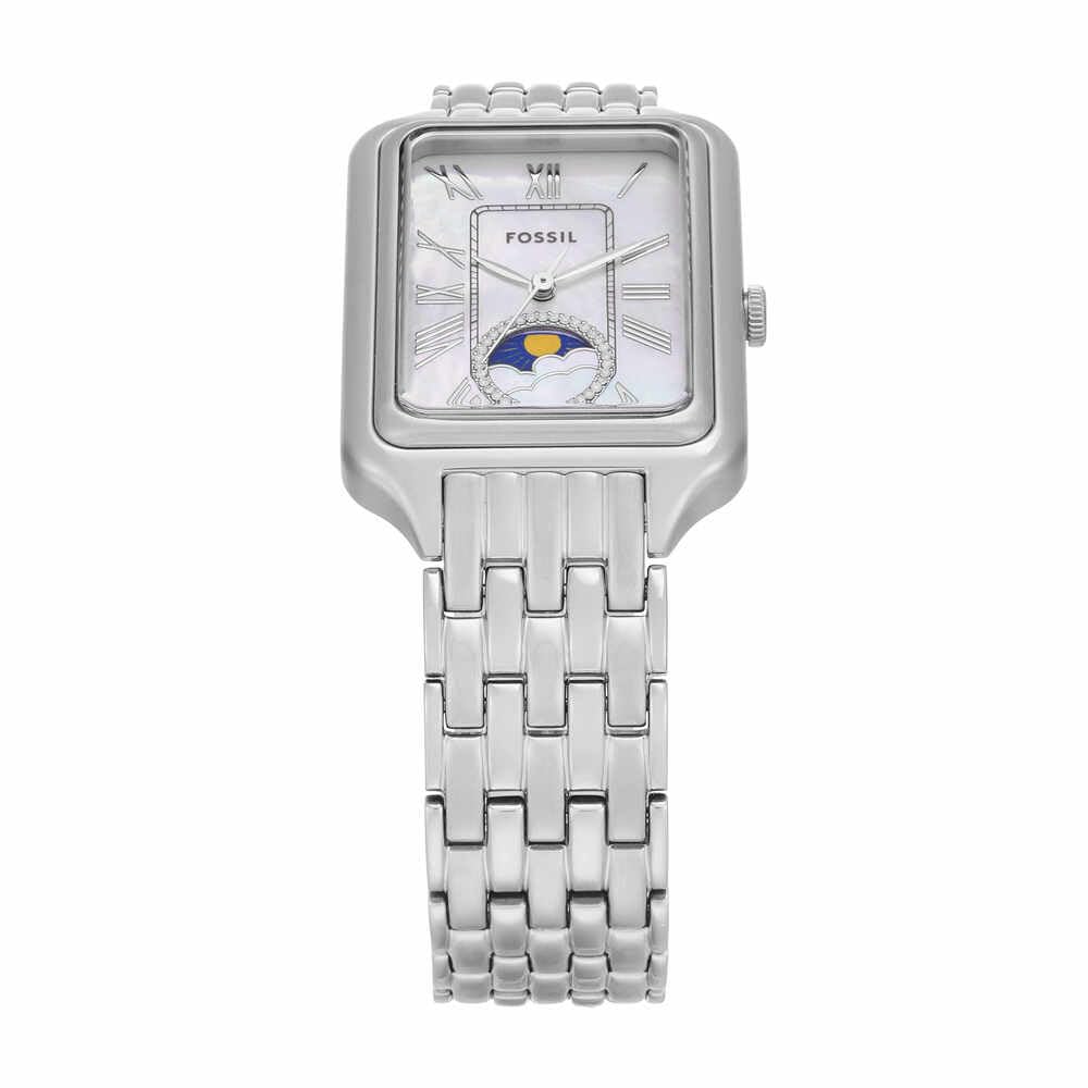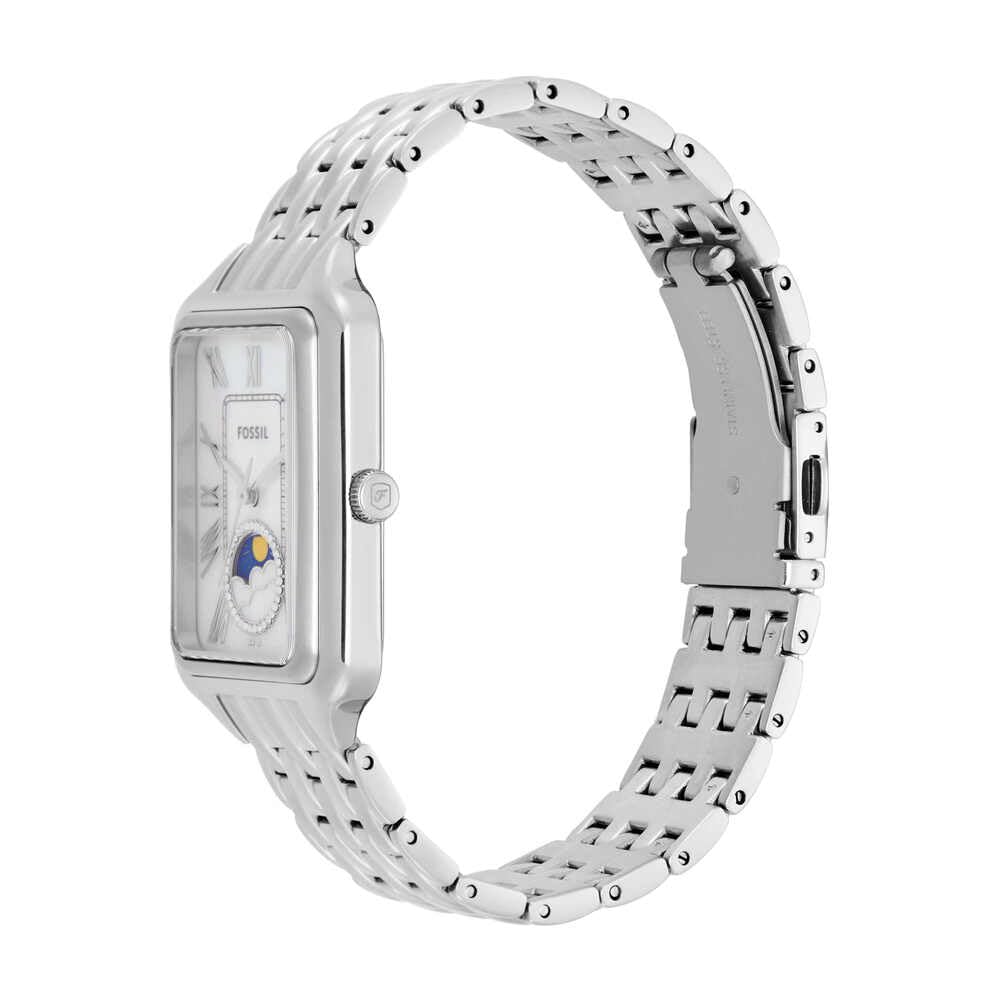 Die Raquel-Uhr ist eine echte Ikone, die wiedergeboren wurde. Ihr schlankes, rechteckiges Gehäuse und ihr Edelstahlarmband strahlen zeitlose Raffinesse aus. Das leuchtend weisse Perlmuttzifferblatt sorgt für Eleganz und das klassische Sun-Moon-Multifunktionswerk für raffinierte Funktionalität. Ein Klassiker im Vintage-Stil und doch erfrischend - ein Klassiker, den Sie immer wieder tragen werden.