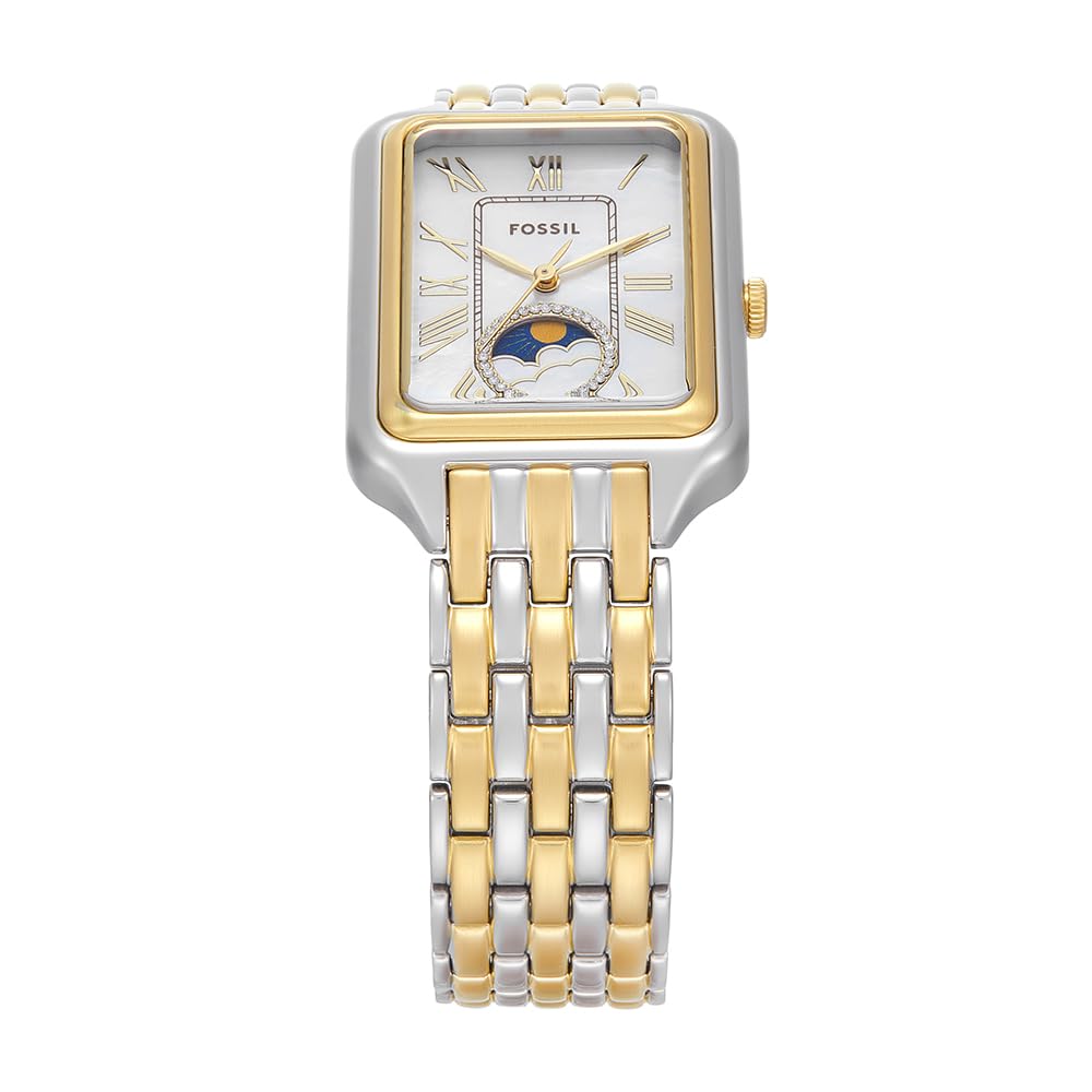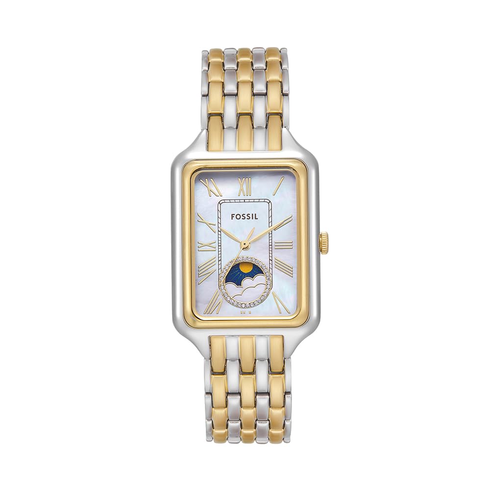 Die Raquel-Uhr ist eine echte Ikone, die wiedergeboren wurde. Ihr schlankes rechteckiges Gehäuse und das zweifarbige Edelstahlarmband strahlen zeitlose Raffinesse aus. Das leuchtend weisse Perlmuttzifferblatt sorgt für Eleganz und das klassische Sun-Moon-Multifunktionswerk für raffinierte Funktionalität. Ein Klassiker im Vintage-Stil und doch erfrischend , den Sie immer wieder tragen werden.