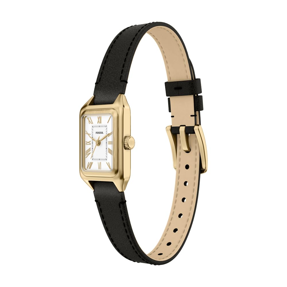 Ein kleines rechteckiges, goldfarbenes Gehäuse umrahmt ein klares, weisses, satiniertes Zifferblatt mit einem stromlinienförmigen 3-Zeiger-Design. Das schwarze Lederband bildet einen dezenten Kontrast und wird mit einer Dornschliesse geschlossen, die sich leicht anpassen lässt.