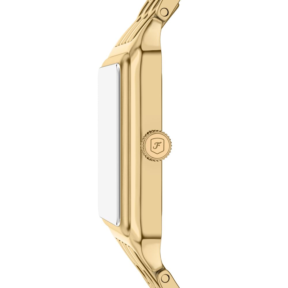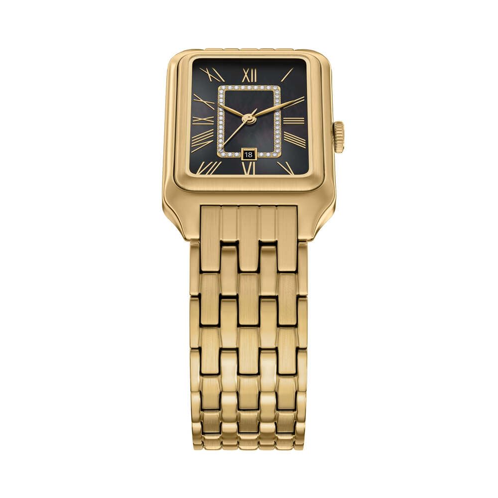 Das rechteckige, goldfarbene Edelstahlgehäuse lässt sich nahtlos mit dem passenden Armband kombinieren und sorgt so für ein poliertes und stimmiges Design. Das glänzende Perlmuttzifferblatt verleiht der Uhr Tiefe und ein subtiles Schimmern, während die Drei-Zeiger-Funktionalität und die Datumsanzeige für Alltagstauglichkeit sorgen. Diese mittelgrosse Uhr wurde mit Bedacht aus hochwertigen Materialien gefertigt und vereint raffinierte Details mit moderner Vielseitigkeit.