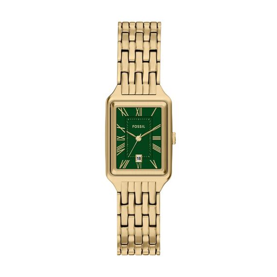 Das rechteckige, goldfarbene Edelstahlgehäuse geht in das Band über und sorgt so für ein elegantes und stimmiges Design. Das satingrüne Zifferblatt setzt einen raffinierten Farbakzent und verfügt über eine klare 3-Zeiger-Anzeige und ein praktisches Datumsfenster. Diese Uhr ist mit einer Faltschliesse mit zwei Drückern ausgestattet und kombiniert durchdachte Details und hochwertige Materialien zu einem polierten, alltäglichen Accessoire.