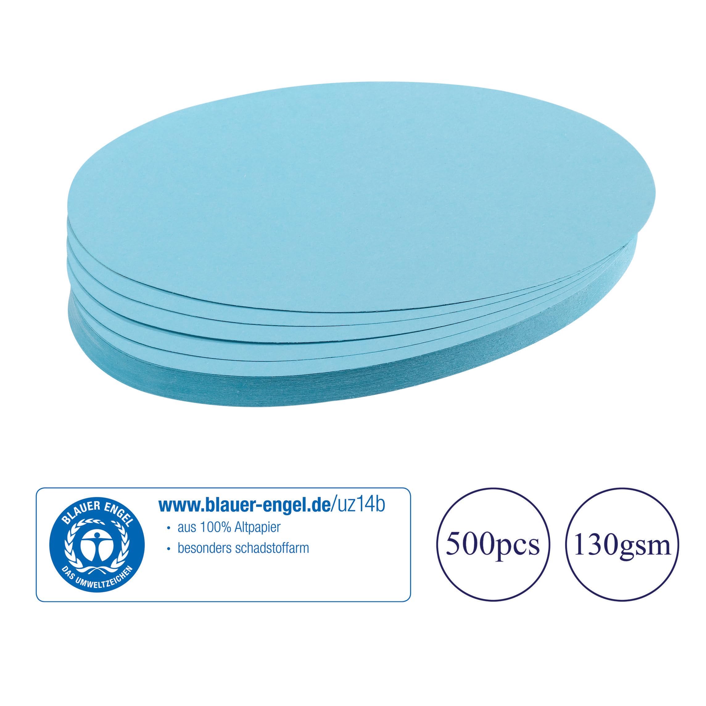 Moderationskarten sind umweltfreundlich, da sie aus 100 % Altpapier hergestellt sind, 130 g/qm. Zertifiziert mit dem Blauen Engel nach UZ14b. Moderationskarte, Oval · Werkstoff: 100% Altpapier · Flächenmasse des Papiers: 130 g/qm · Grösse (B x H) oder (Ø): 190 x 110 mm · Farbe: hellblau · Ausführung des Inhalts der Packung: 500