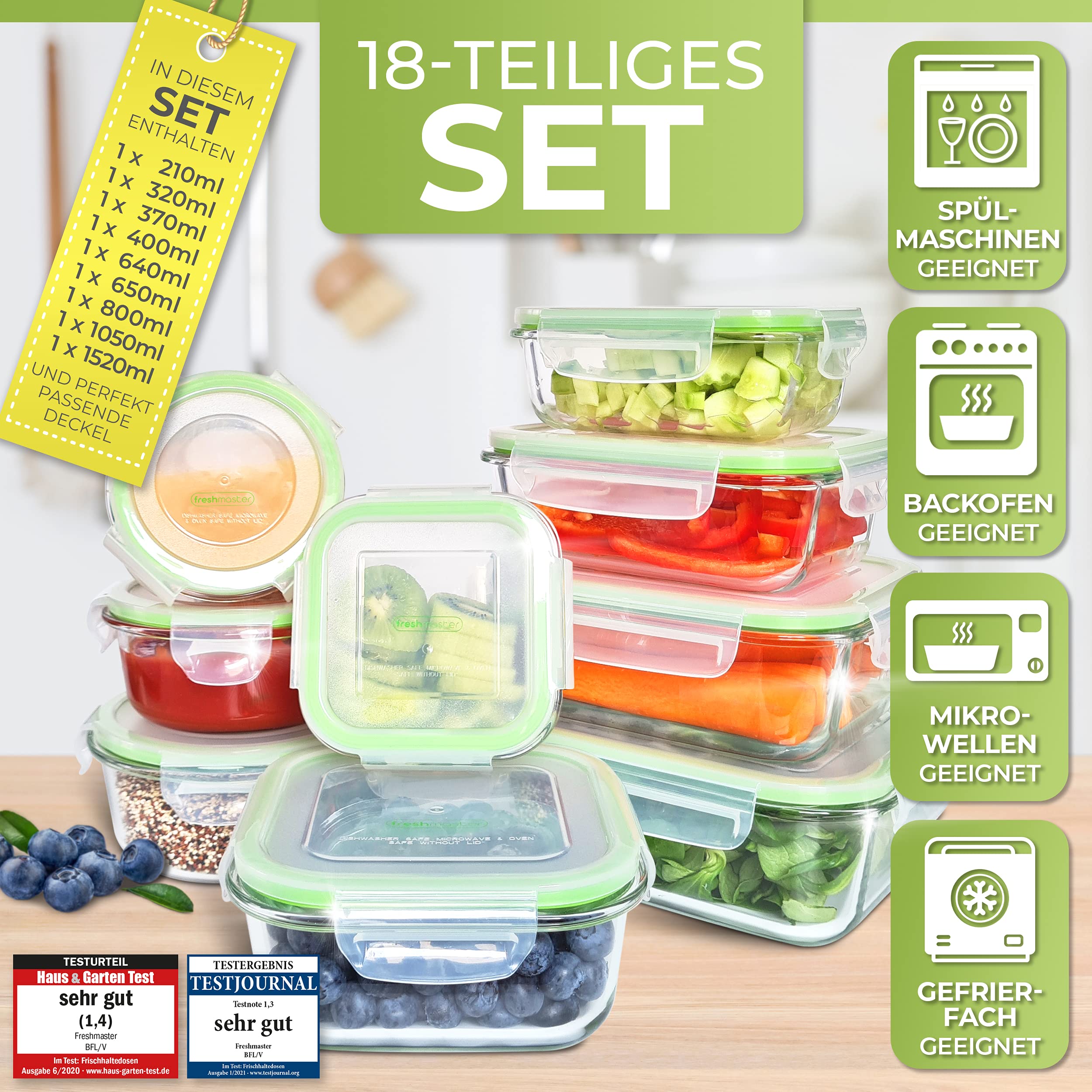 2x TESTURTEIL SEHR GUT - Sofort die richtige Entscheidung treffen und lange Freude an den Frischhaltedosen haben. Robustes Material, dicke Glas Wandstärken, 4fach Dichtungen aus Silikon, längste Haltbarkeit -alles zu einem sehr fairen Preis dank Direktvertrieb.Es freut uns sehr, dass die unabhängige Testzeitschrift Haus + Garten diesen Anspruch mit dem Testurteil SEHR GUT bestätigt hat und auch das Testjournal zu dem Testurteil Sehr Gut (1,3) kam.Ihre Vorteile und der Lieferumfang des 18teiligen Frischhaltedosen Sets:1x 370 ml Frischhaltedose Glas mit Deckel1x 640 ml Vorratsdose Glas mit Deckel1x 1.050 ml Behälter Glas mit Deckel1x 1.520 ml Boxen Glas mit Deckel1x 320 ml Frischhaltedose Glas mit Deckel1x 800 ml Vorratsdose Glas mit Deckel1x 210 ml Behälter Glas mit Deckel rund1x 400 ml Frischhaltedose Glas mit Deckel rund1x 650 ml Vorratsdose Glas mit Deckel rundVorratsdosen Glas mit Deckel 100% luftdichtMeal Prep Boxen 100% spülmaschinenfestKüche Aufbewahrung & Organisation 100% geeignet für Mikrowellen Küchen Zubehör 100% geeignet für Backofen bis 560 Grad (ohne Deckel)Vorratsdosen mit Deckel 100% geeignet für Gefrierschrank bis minus 40 GradGlasdose mit Deckel und 4fach Silikondichtung für beste HaltbarkeitSie möchten Lebensmittel künftig gesund und auslaufsicher aufbewahren, sicher transportieren und lange Freude an ihrer neuen plastikfreien Glasbehältern haben? Dann zögern Sie bitte nicht und klicken oben rechts zum Einführungspreis ganz einfach auf "jetzt kaufen". Unser deutscher Kundensupport hilft Ihnen telefonisch und per eMail stets gerne weiter. Und falls doch mal etwas nicht stimmt? Dann erstatten wir Ihnen den Kaufpreis sofort - ohne Wenn und Aber, denn nur Ihre Zufriedenheit entscheidet.