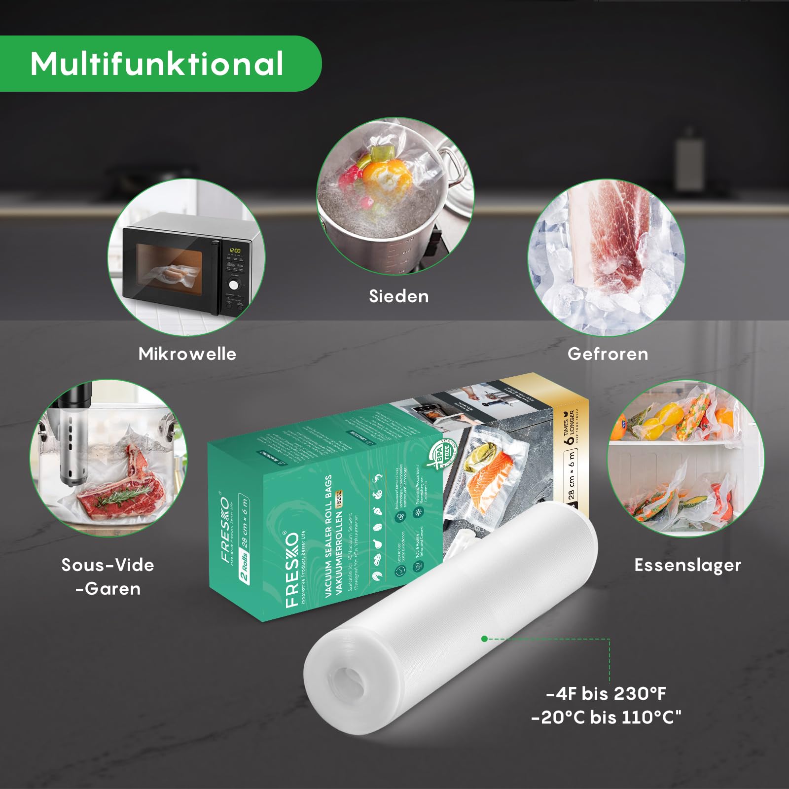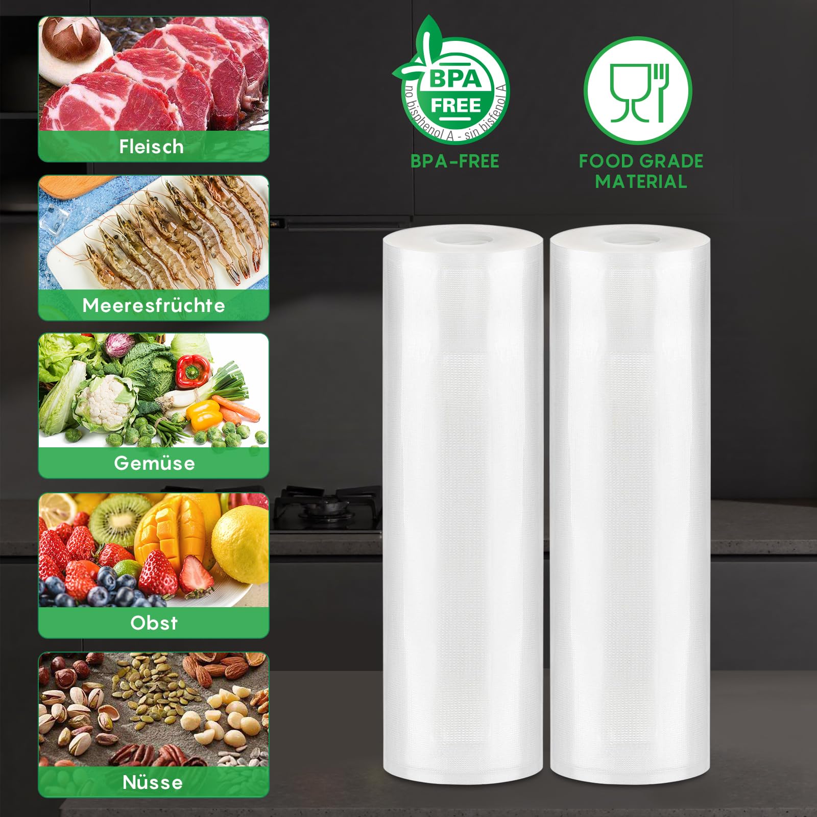 FRESKO Vakuumrollen 2 Rollen 28 x 600cm, Professionelle Vakuumierbeutel Folienbeutel, Grösse für alle Vakuumiergeräte, BPA-frei, Geprägte Luftrillen, Sous-Vide-Gefrierbeutel