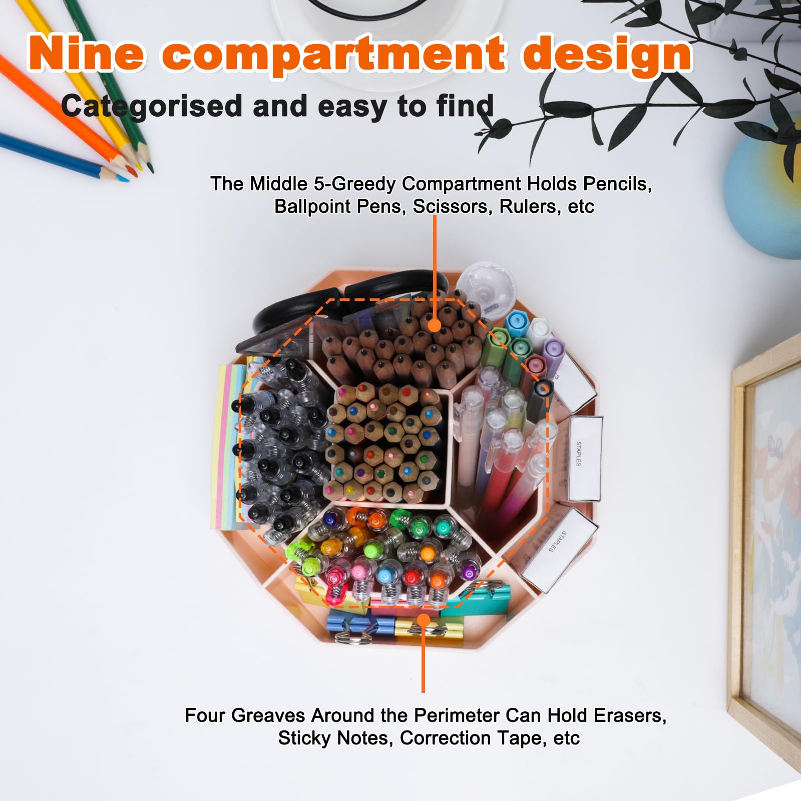 FRETONBA Rotierende Stiftehalter Schreibtisch Organizer, Büro Organizer Stifte Organizer mit 9 Fächern, 360 Grad Stiftehalter Drehbar, Grosse Kapazität, Rosa