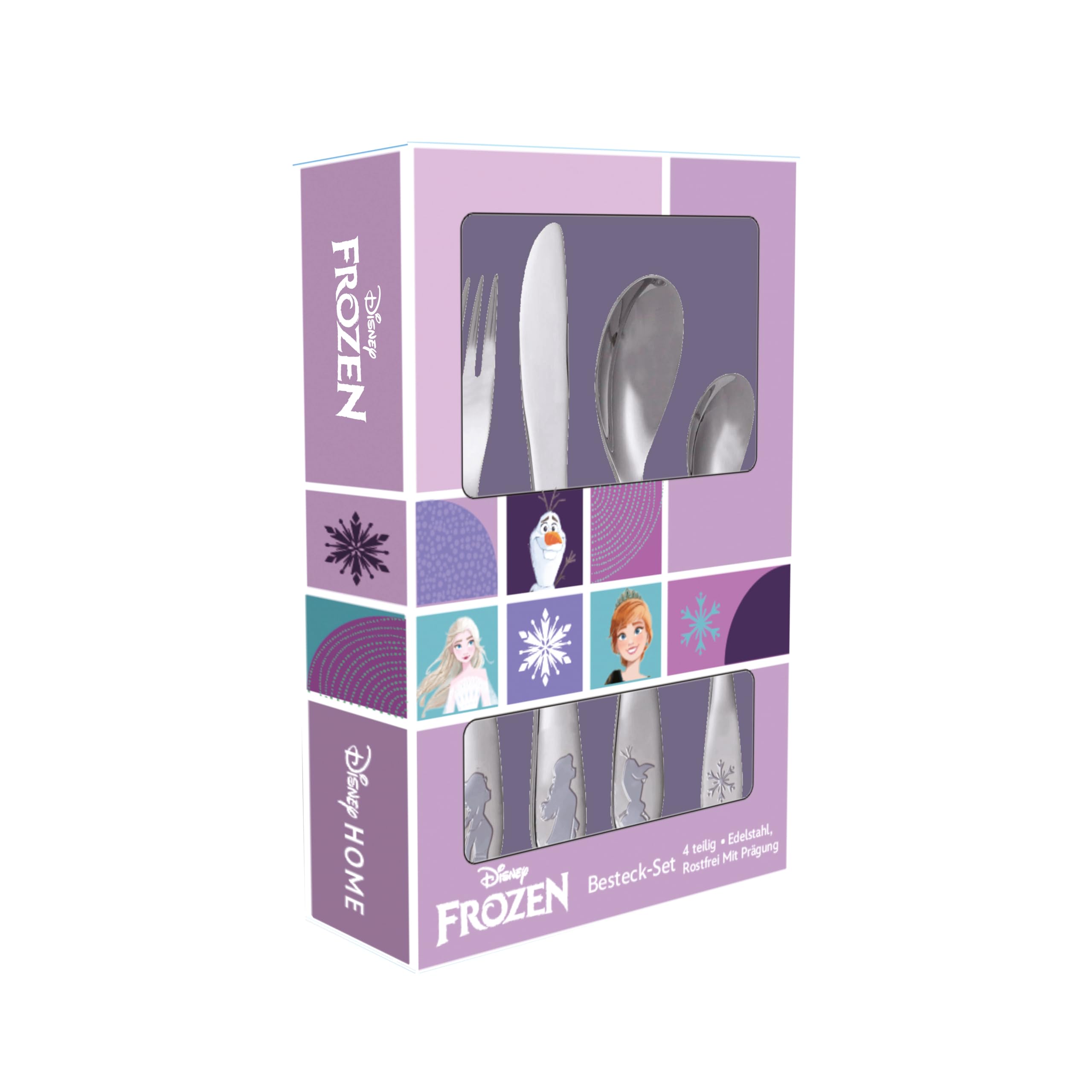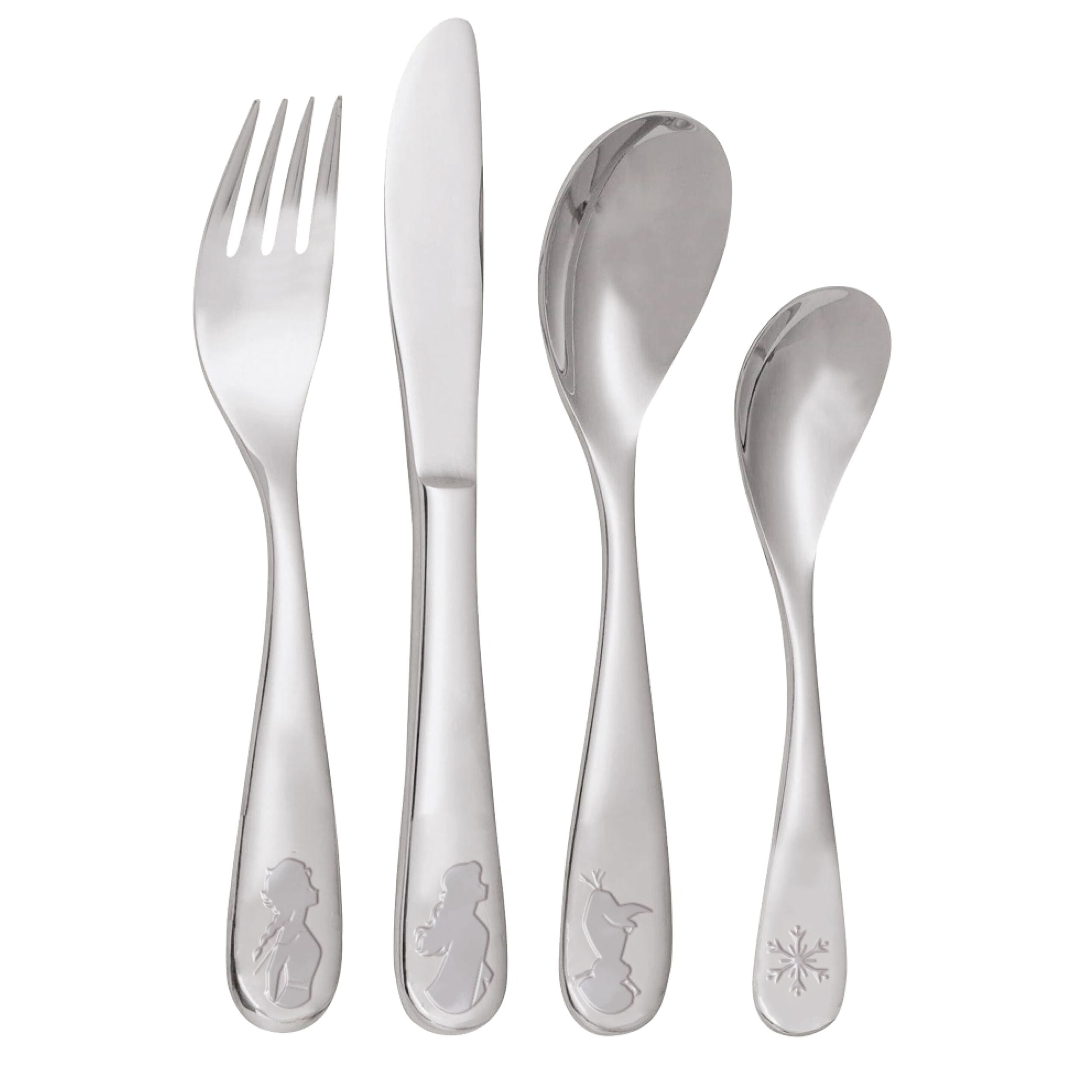 Frozen Die Eiskönigin Kinderbesteck Set 4-teilig - Edelstahl rostfrei mit Messer, Gabel, Suppenlöffel und Dessertlöffel - geprägtes Motiv mit Elsa, Anna und Olaf - spülmaschinengeeignet, kindgerecht
