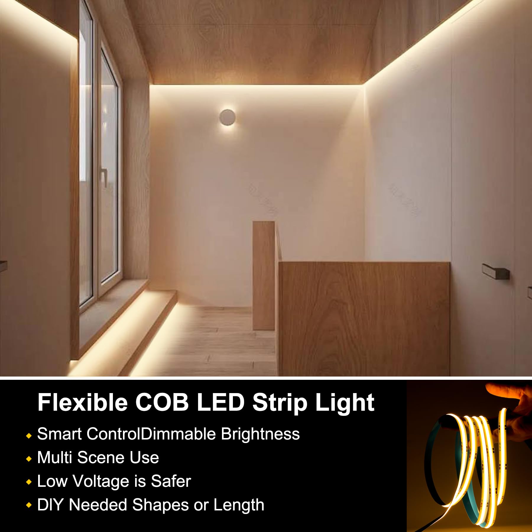 Produktspezifikationen: Länge: 5 Meter Stromversorgung: Enthalten Dimmbar: Smart APP und Fernsteuerung Dimmen Farbwiedergabe-Index (CRI): >90 Breite: 8mm Spannung: DC24V Farbtemperatur: Neutralweiss 4000K Produkt-Highlights: Der FUIQI COB LED Streifen (auch bekannt als COB LED Band, COB Lichtband oder COB Flexband) ist eine hochwertige und makellose Beleuchtungslösung für Ihre Heimdekoration. Mit einem CRI von über 90 bietet dieser COB LED Beleuchtungsstreifen eine natürliche und genaue Farbwiedergabe, die die Schönheit Ihres Raumes unterstreicht. Dank der intelligenten APP und der Dimmfunktion der Fernbedienung können Sie die Helligkeit des COB LED Lichtstreifens ganz einfach anpassen und so das perfekte Ambiente für jede Gelegenheit schaffen. Das schlanke Design des COB LED Tapes mit einer Breite von nur 8 mm ermöglicht eine unauffällige Installation an verschiedenen Orten – ob als COB LED Leiste in Schränken, als COB LED Lichtleiste in der Küche oder als dekorative Beleuchtung im Schlafzimmer. Verwendungsszenarien: Ideal für den Einsatz in Schlafzimmern, Küchen und Schränken, schafft dieser COB LED Streifen eine gemütliche und einladende Atmosphäre in Ihren Wohnräumen. Ganz gleich, ob Sie Ihrem Schlafzimmer einen Hauch von Wärme verleihen, Ihre Küchenarbeitsflächen mit dem COB LED Lichtband beleuchten oder Ihre Schrankauslagen mit dem COB LED Flexband akzentuieren möchten – dieser vielseitige COB LED Beleuchtungsstreifen lässt sich leicht an Ihre individuellen Bedürfnisse anpassen.