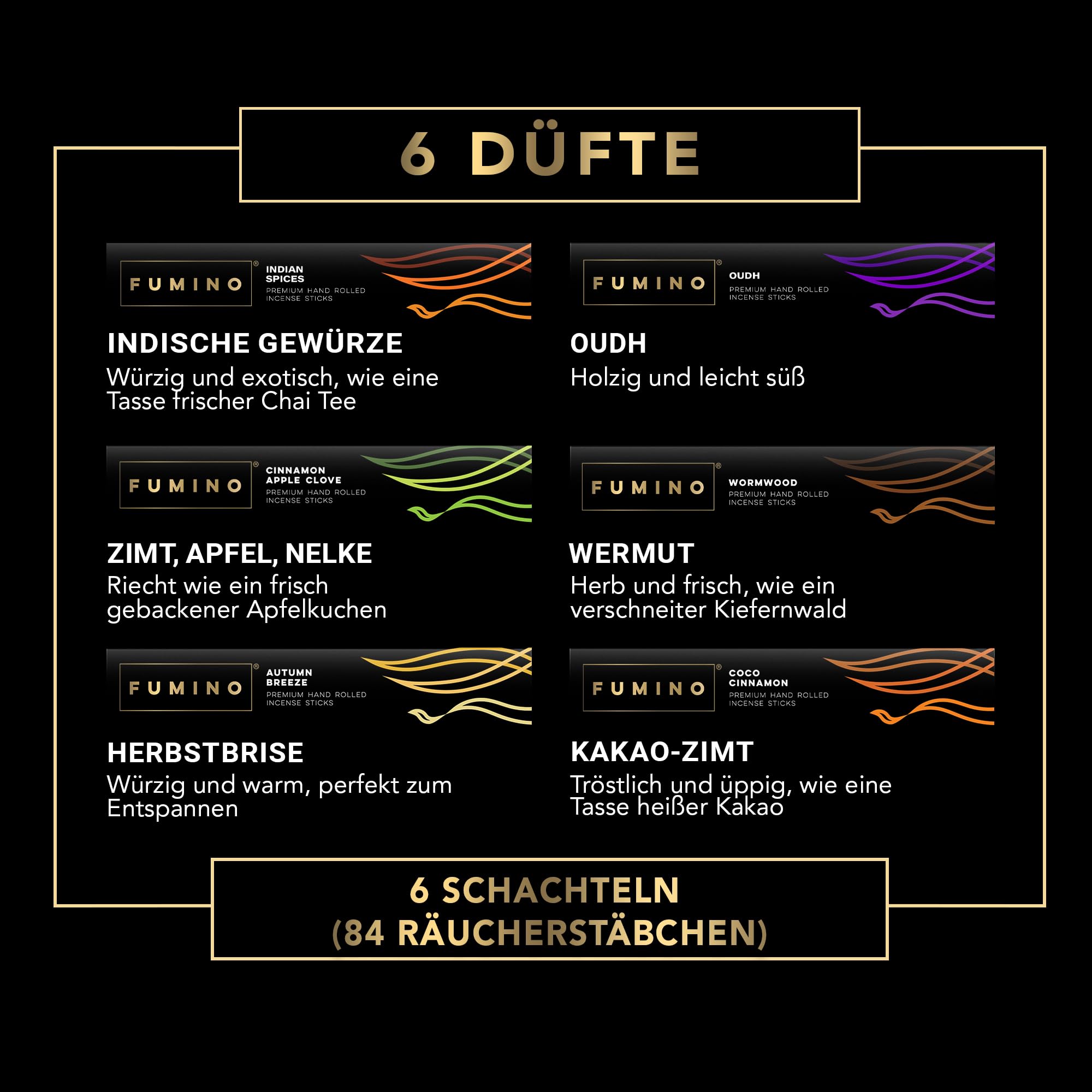 Fumino Räucherstäbchen Set Kamin & Frost – Handgefertigte Masala Agarbatti für Entspannung, Meditation & Duft – 6 Boxen, 84 Stäbchen