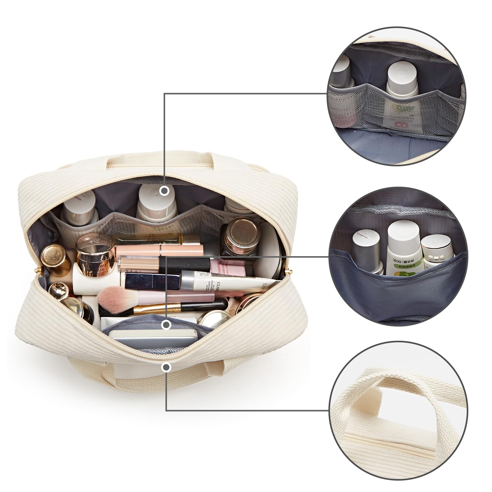 Der grosszuegige Stauraum bietet ausreichend Platz fuer Make-up, Pflegeprodukte, Toilettenartikel und persoenliche Accessoires. Dank der durchdachten Form lassen sich alle Utensilien uebersichtlich organisieren und schnell wiederfinden – ideal fuer das Badezimmer, den Koffer, das Handgepaeck oder die Sporttasche.