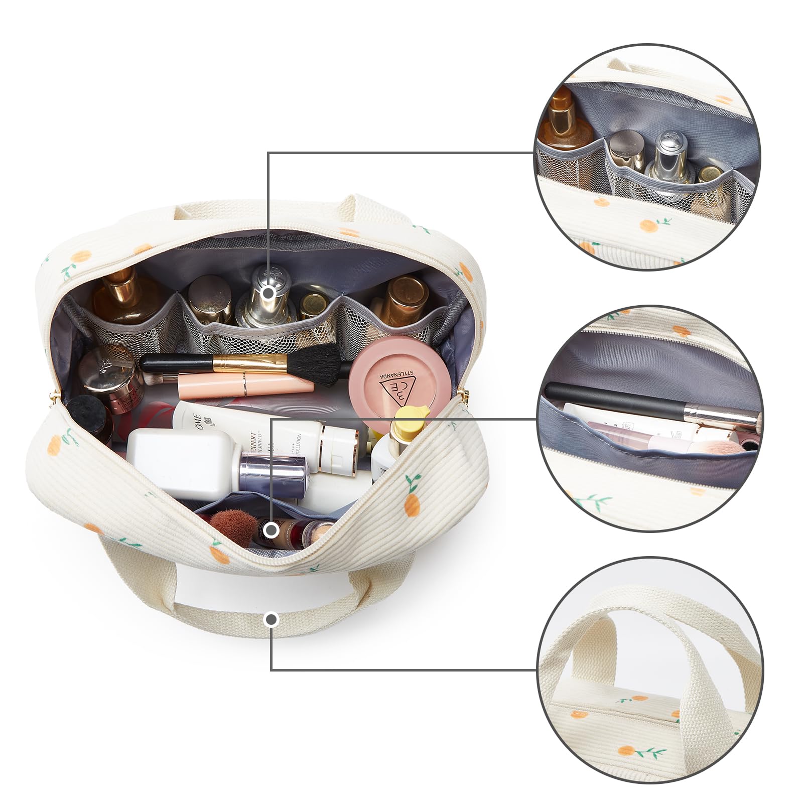 Der grosszuegige Stauraum bietet ausreichend Platz fuer Make-up, Pflegeprodukte, Toilettenartikel und persoenliche Accessoires. Dank der praktischen Form lassen sich alle Inhalte uebersichtlich organisieren und schnell wiederfinden – ideal fuer das Badezimmer, den Koffer, das Handgepaeck oder unterwegs.