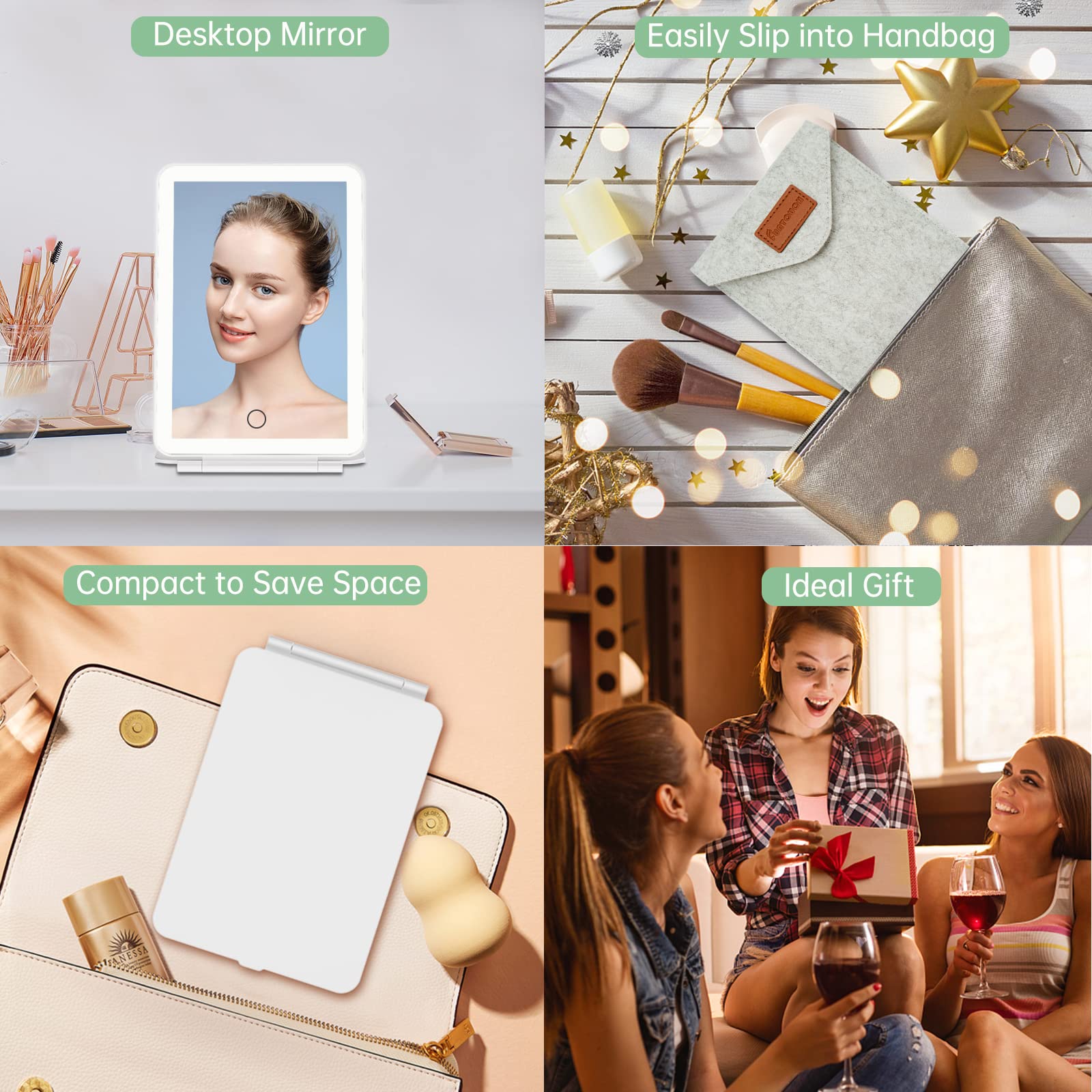 LED-Schminkspiegel für die Reise mit tragbarem Licht 72 hellere aktualisierte LED-Lichter Der verbesserte Schminktisch mit Spiegel und Lichtspiegel ist mit 72-teiligen einstellbaren LED-Lichtleisten integriert, kann die dunkelsten und am wenigsten beleuchteten Bereiche beleuchten. Regulierbares natürliches Licht, perfekt für Büro, Zuhause, Räume mit wenig Licht und die meisten Orte. Einstellbarer Touchscreen-Sensor. Drücken Sie kurz auf den Sensorschalter, um zwischen den 3 Lichtfarben zu wechseln: weiss, gelb, weiss + gelb. Lange drücken, um die Helligkeit einzustellen. Die kontinuierliche Dimmtechnologie macht diesen beleuchteten Schminkspiegel viel intelligenter als herkömmliche Make-up-Spiegel. Doppelte Stromversorgung: Dieser beleuchtete LED-Schminkspiegel für den Kosmetik-Schreibtisch/Reise kann mit 4 AA-Batterien (nicht im Lieferumfang enthalten) oder mit einem USB-Kabel betrieben werden, damit er funktioniert. Dieser Spiegel kann keine Energie allein speichern, er ist ein ideales Geschenk für besondere Tage.