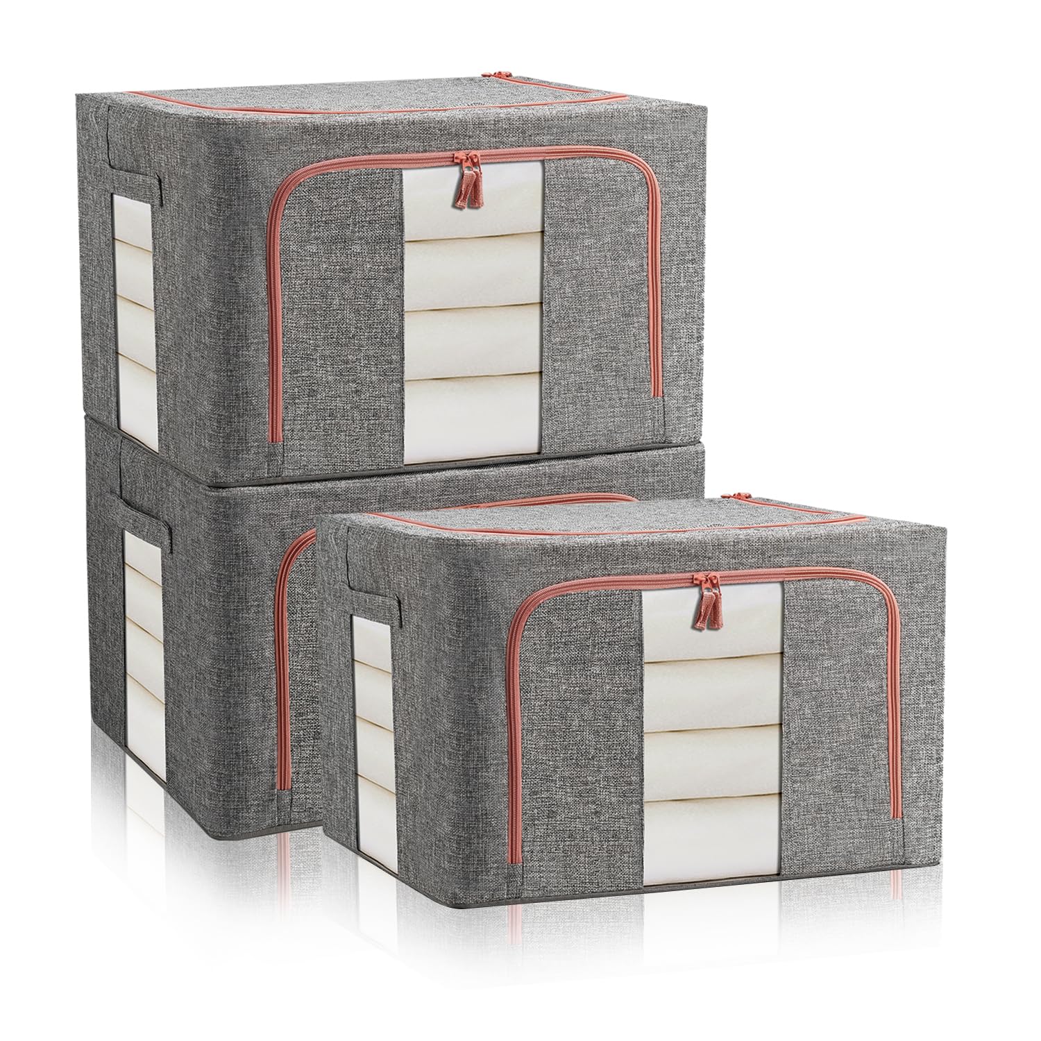 FUSACONY 3 Stück Aufbewahrungsbox, Kleiderschrank Organizer Faltbar Kleideraufbewahrung Box mit Metallrahmen, Aufbewahrungstasche für Kleidung, Bettdecken, Decken, Bettwäsche Grau (66L)