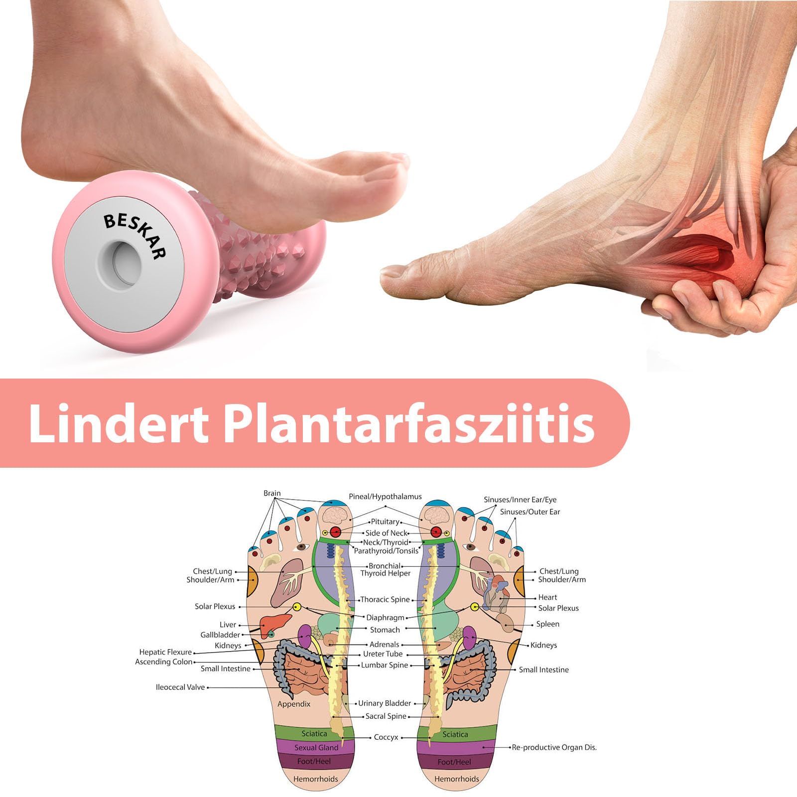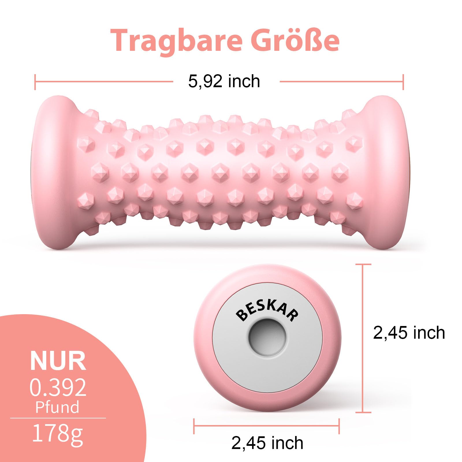 BESKAR Fussmassagerolle – Tragbarer Gummi-Massageroller für Plantarfasziitis, Fussgewölbe-Schmerzen, Triggerpunkt- & Tiefengewebemassage, Fuss-Reflexzonenmassage