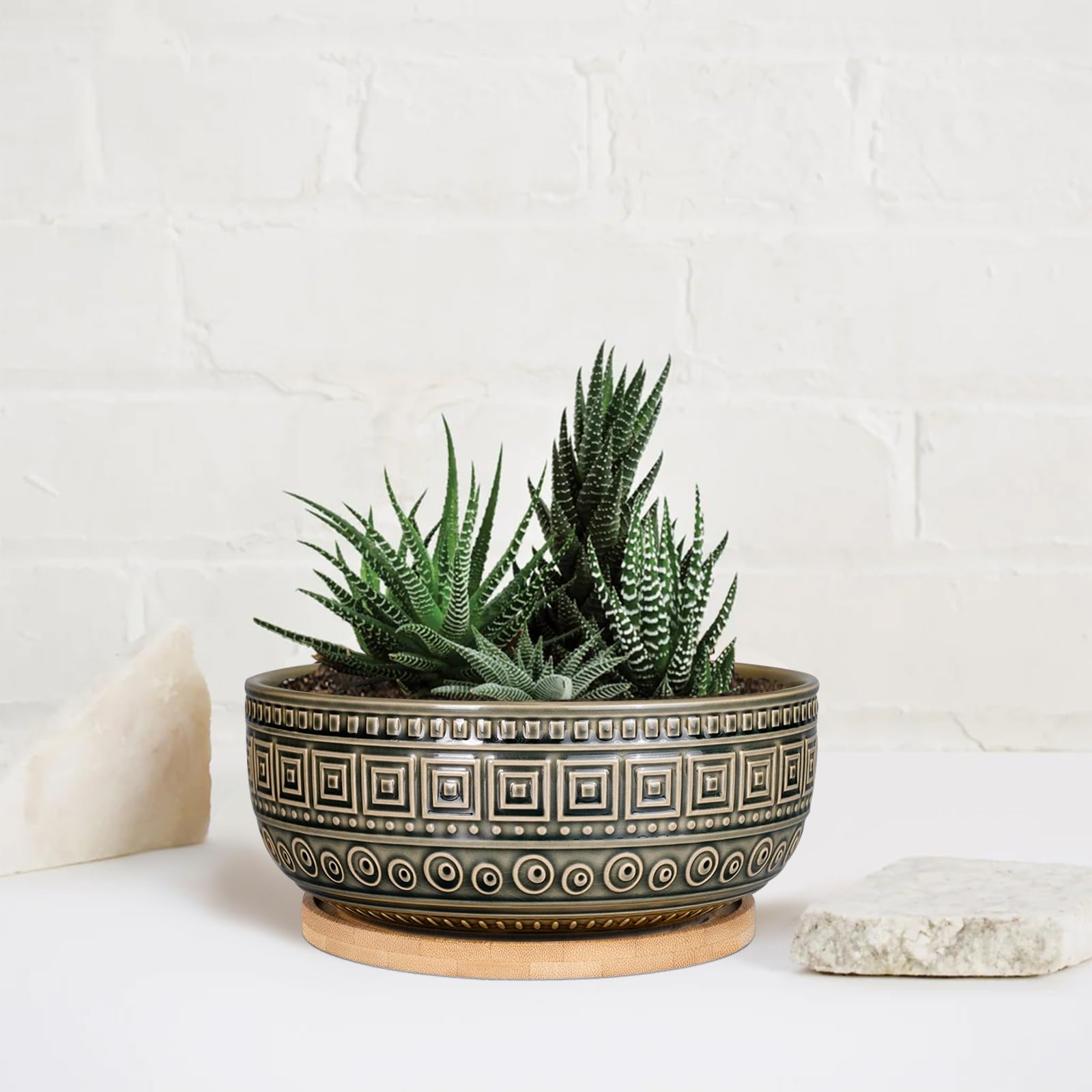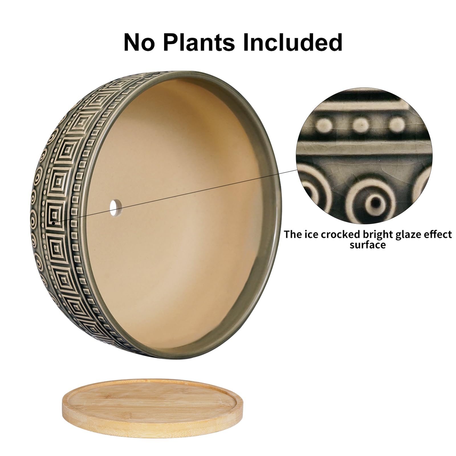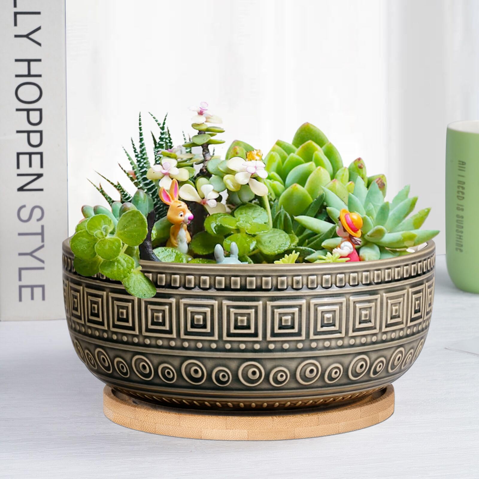Keramik-Sukkulententopf von G EPGardening mit Abflussloch und Bambusuntersetzer, Bonsai-Pflanzentopf für Zimmerpflanzen, grosser Blumentopf, grauer Blumentopf, 20,3 cm. Topfgrösse: Der flache Keramikpflanzentopf misst 20,3 x 20,3 x 7,6 cm (L/B/H), der Bambusuntersetzer misst 16 x 16 x 0,5 cm (L/B/H). Blumentopf-Design: Unsere mittelgrossen Blumentöpfe für den Innenbereich sind mit einzigartigen weissen Wortmustern gestaltet. Der retro glasierte Keramikblumentopf ist sowohl schön als auch künstlerisch. Stabiler Topf: Hergestellt aus hochwertiger Keramik ist der runde Bonsai-Topf robust und langlebig. Die Sukkulententöpfe mit Abfluss und der Bambusuntersetzer sind getrennt, was eine bequeme Nutzung ermöglicht. Innen- und Aussendekoration: Dieser 20,3 cm grosse Blumentopf ist für verschiedene Innen- und Aussenpflanzen geeignet, wie Sukkulenten, Kräuter, Aloe, Kakteen, Bonsai usw. Bringe dekorative Abwechslung in Schlafzimmer, Büros, Schreibtische, Fensterbänke, Innenhöfe und mehr. Ideales Geschenk: Dieser 20,3 cm grosse runde Sukkulententopf ist ein ideales Geschenk für Gartenanfänger und Pflanzenliebhaber.