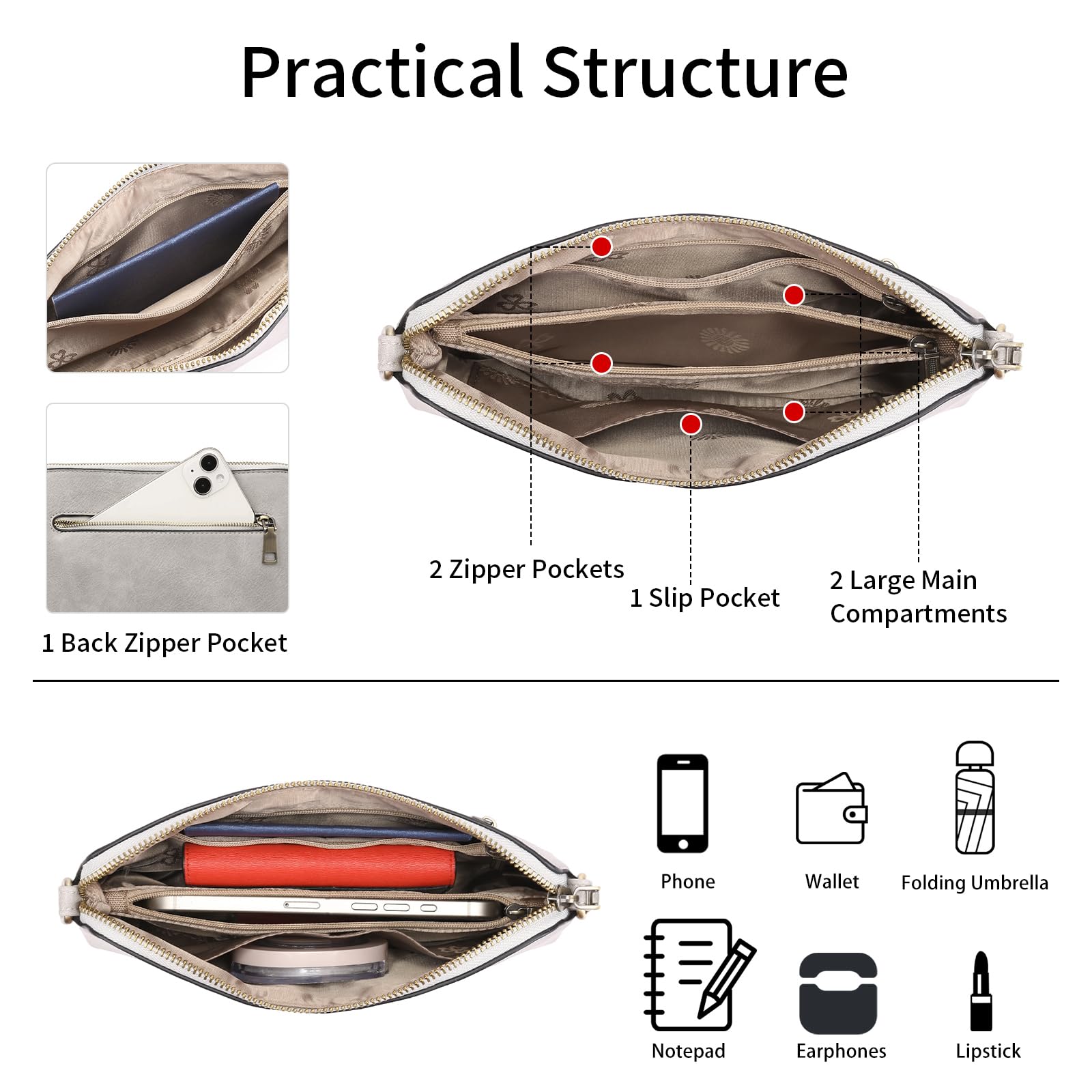 - Gut organisiert und praktisch: Die Handtaschen für Damen umfassen 2 Hauptfächer, 2 Innentaschen mit Reissverschluss, 1 Innentasche mit Einschub und 1 hintere Reissverschlusstasche. Sie können kleine Brieftaschen, grosse Telefone in Übergrösse, Haarkämme, Schlüssel, Sonnenbrillen, Make-up-Accessoires und andere Dinge des täglichen Bedarfs bequem aufbewahren. Diese Umhängetasche ist leicht und einfach zu transportieren und eignet sich sowohl für Reisen als auch für den täglichen Gebrauch