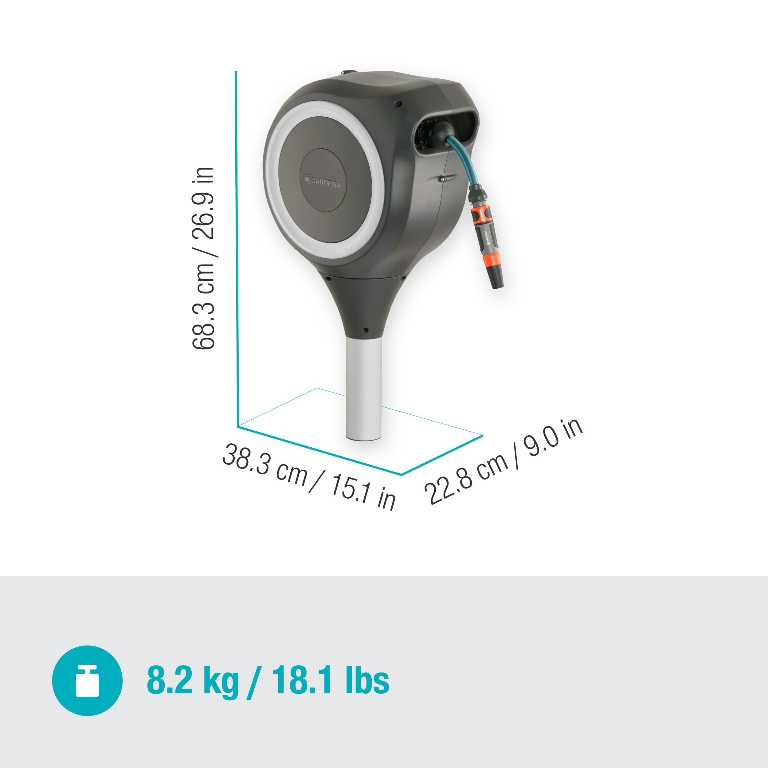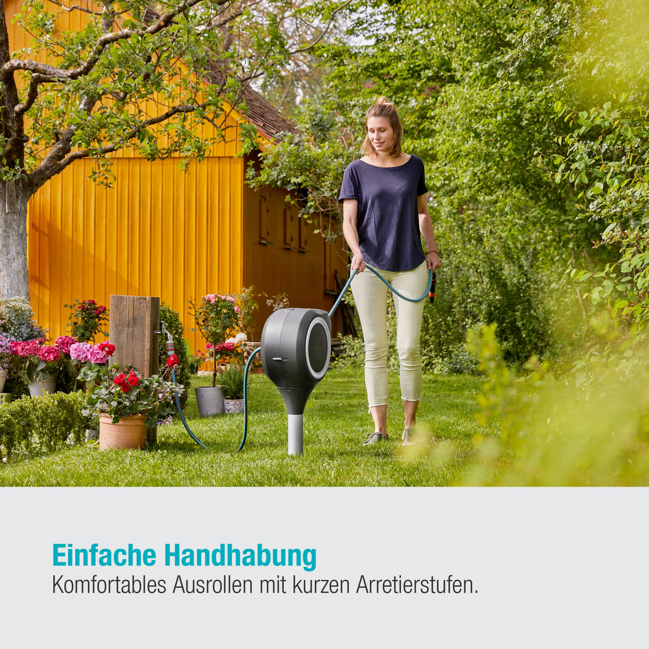 Gardena Garten-Schlauchbox RollUp S - Die ideale Lösung für kleinere Gärten und Terrassen | Die automatische Gardena Garten-Schlauchbox RollUp S bietet höchsten Komfort bei der Gartenbewässerung. Der Gartenschlauch sofort einsatzbereit und nach dem Giessen schnell und ohne zu verknoten wieder verwahrt. Die Gartenschlauchbox wird mittels Erdspiess aus Metall im Erdreich befestigt und ist absolut flexibel einsetzbar. Die kompakte Box lässt sich um 360° drehen. Mit kurzen Arretierstopps kann der Schlauch auf die gewünschte Länge ausgezogen werden. Dank RollControl genügt ein kurzer Zug am Schlauch und er wird mit gleichmässiger Geschwindigkeit und sicher automatisch wieder aufgerollt. Die Gartenschlauchbox ist UV- und Frostsicher. Maximale Bewegungsfreiheit | Die Garten-Schlauchbox RollUp S kann sogar dort im Boden befestigt werden, wo ein Gardena Mähroboter im Einsatz ist, denn er kann unter der Box durchfahren und ungestört seine Runden auf dem Rasen drehen. Gardena - Seit über 45 Jahren vertrauen Gartenbesitzer Original Gardena Bewässerungssystemen!