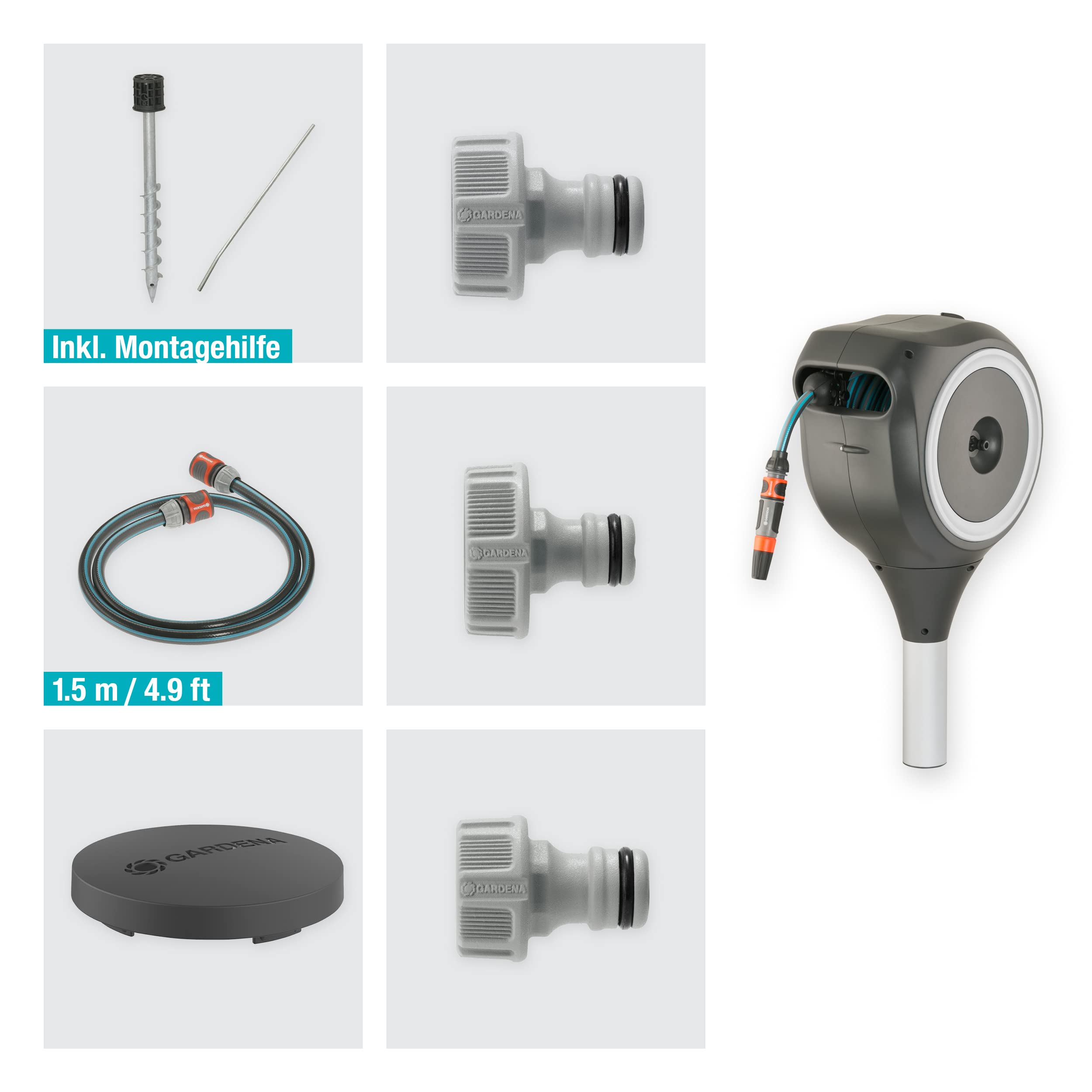 Gardena Garten-Schlauchbox RollUp S (weiss) 15 m: Schwenkbare Schlauchbox, integrierte Schlauchführung, inkl. 15 m Gardena Qualitätsschlauch, Erdspiess und Montagehilfe (18606-20)