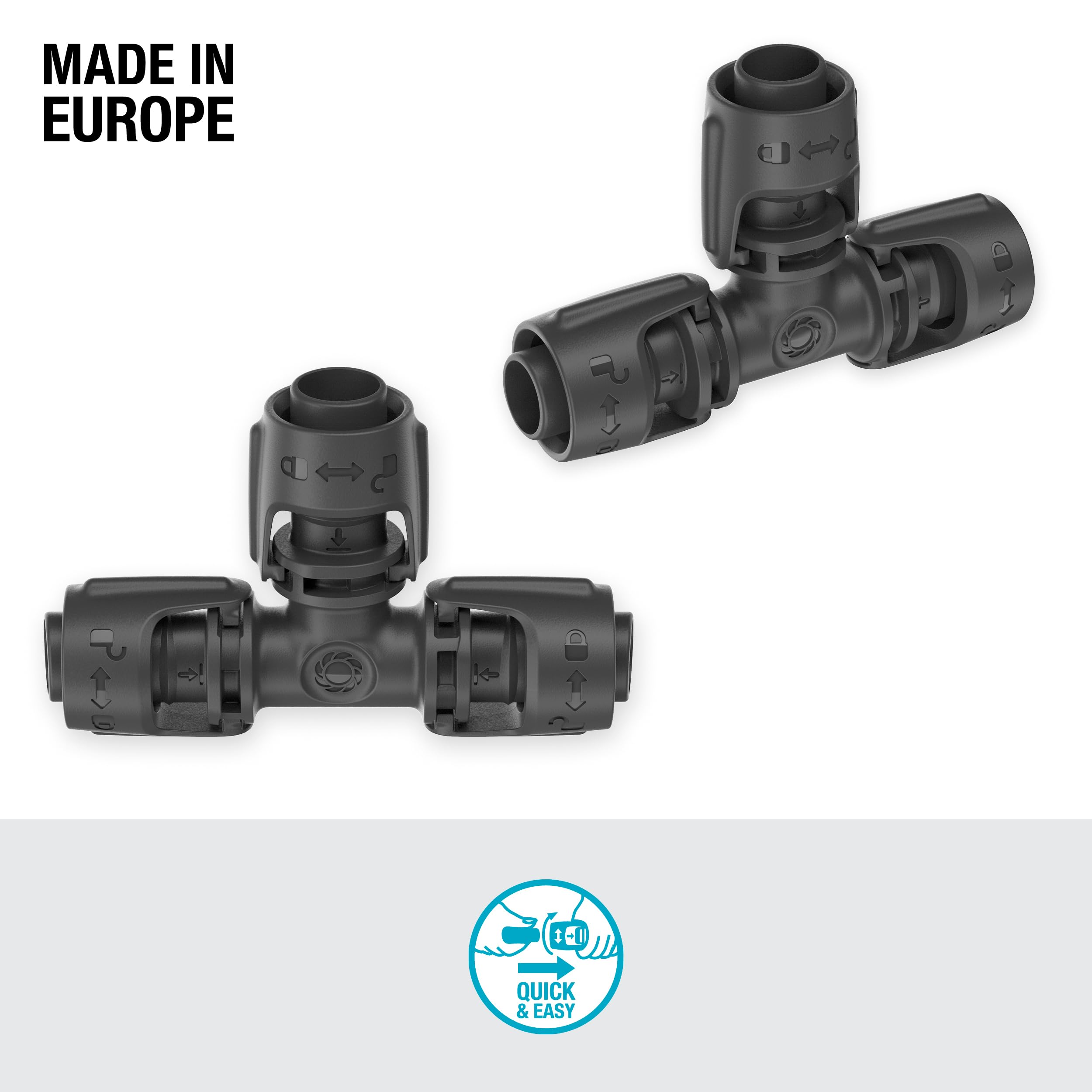 Gardena Micro-Drip-System T-Stück 13 mm (1/2 Zoll) – Für eine T-förmige Abzweigung eines 13 mm Verlegerohres | Die zwei enthaltenen T-förmigen Verbindungsstücke können in Kombination mit einem Verlege- und Tropfrohr der Micro-Drip-Systemreihe als einfache Abzweigung oder Verbindung dienen. Die selbsterklärende Symbolik vereinfacht dabei die Installation. Ausserdem signalisiert das Feedback-Klicken beim Anschliessen des Verbindungsteils eine zuverlässige Abdichtung und geschlossene Position. Eine Erweiterung durch andere Teile ist dank der patentierten Quick & Easy Verbindungstechnik von Gardena schnell, einfach und flexibel durchzuführen. Diese ermöglicht es auch, die Konnektoren schnell und leicht wieder voneinander zu trennen, ohne das Material dabei zu beschädigen. Somit können die Teile nachhaltig wiederverwendet werden. In Kombination mit dem separat erhältlichen Basisgerät 1000 (Art.-Nr. 13333-20) oder Basisgerät 2000 (Art.-Nr. 13310-20) schliesst zuverlässig und dichtet ideal bei einem gleichmässigen Wasserdruck ab.