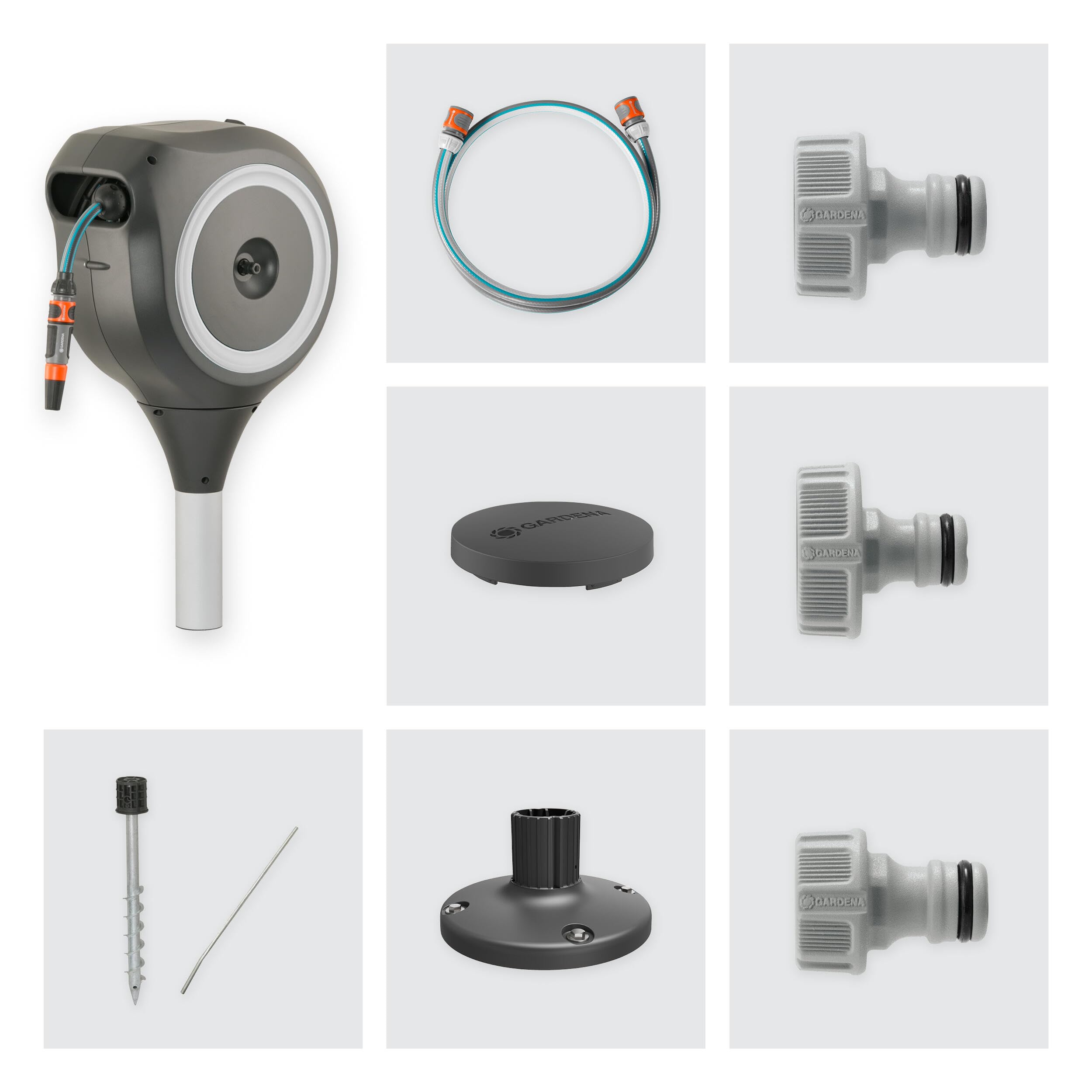 GARDENA Garten-Schlauchbox RollUp M (weiss) 20 m, Schwenkbare Schlauchbox, integrierte Schlauchführung, inklusive 20 m Gardena Qualitätsschlauch, Erdspiess und Montagehilfe (18616-60)