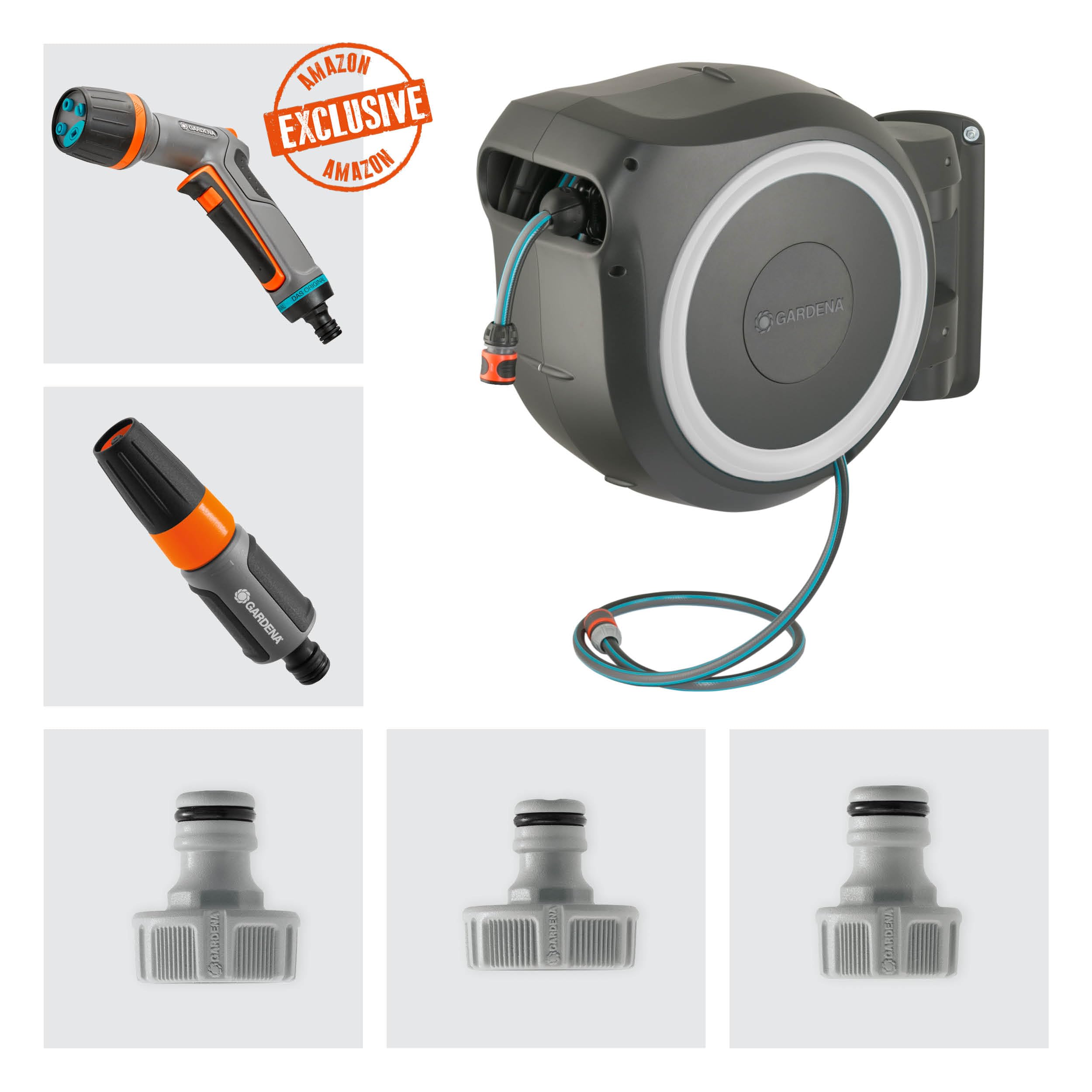 Gardena Wand-Schlauchbox RollUp L (weiss) 30 m exklusiv für Amazon: Schwenkbare Schlauchbox, integrierte Schlauchführung, inkl. 30 m Gardena Qualitätsschlauch, Reinigungsspritze und Brause (18627-38)