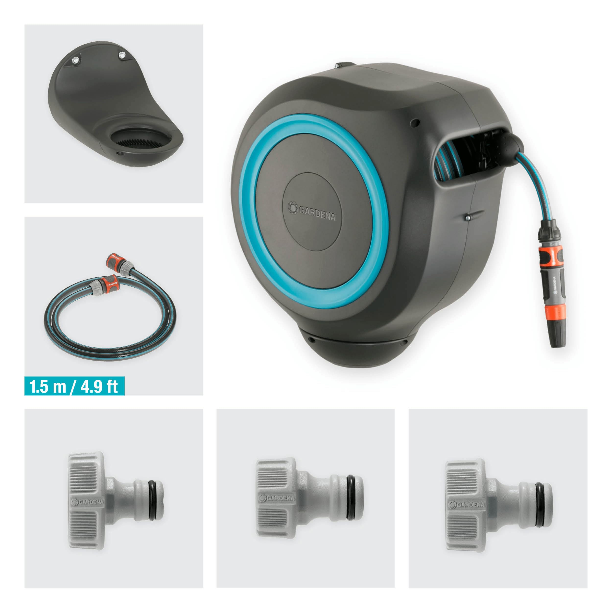 Gardena Wand-Schlauchbox RollUp M (türkis) 20m: Flexible Bewässerung für mittelgrosse Gärten, schwenkbare Schlauchtrommel, mit Wandhalterung, Systemteilen und Spritze inkl. 20m Schlauch (18610-20)