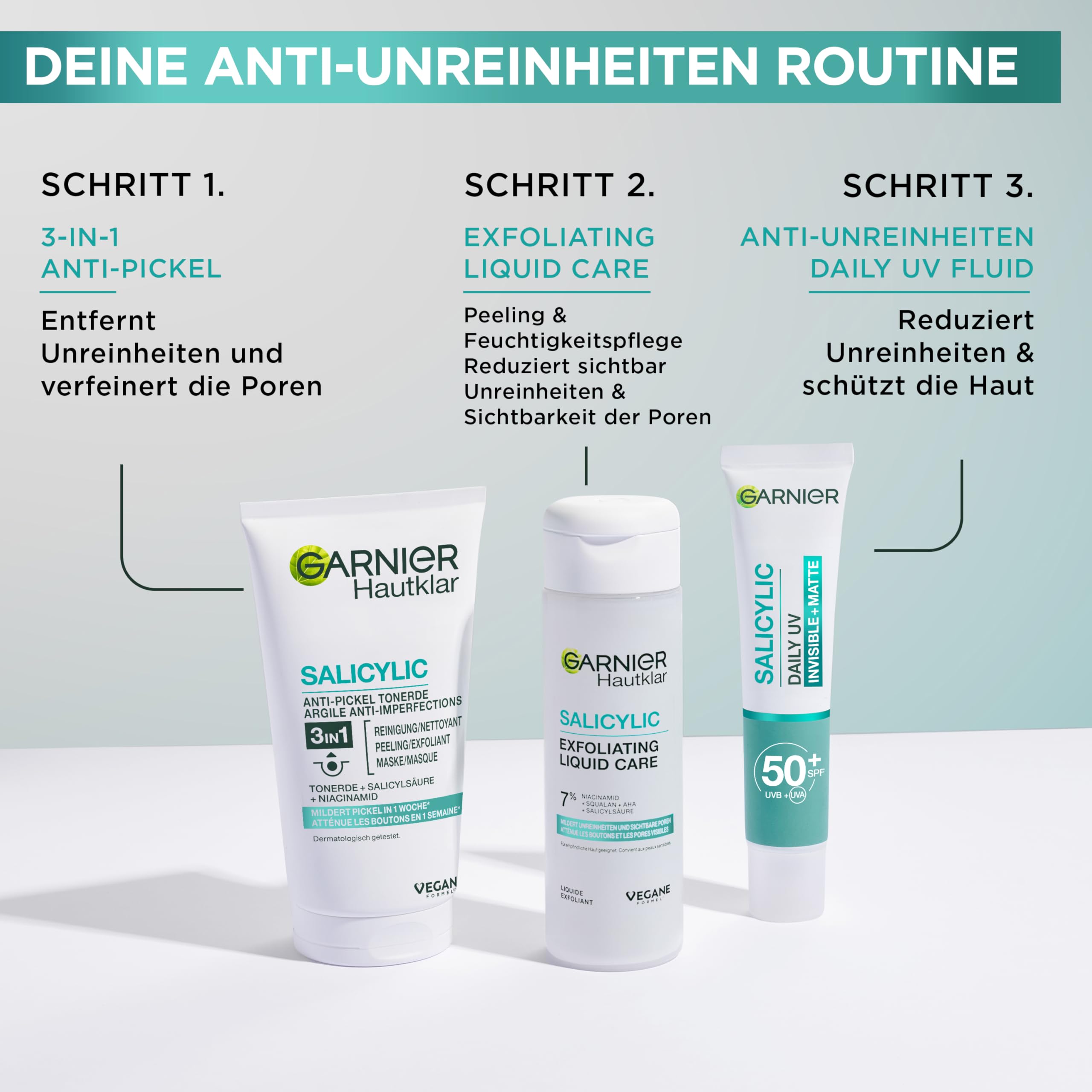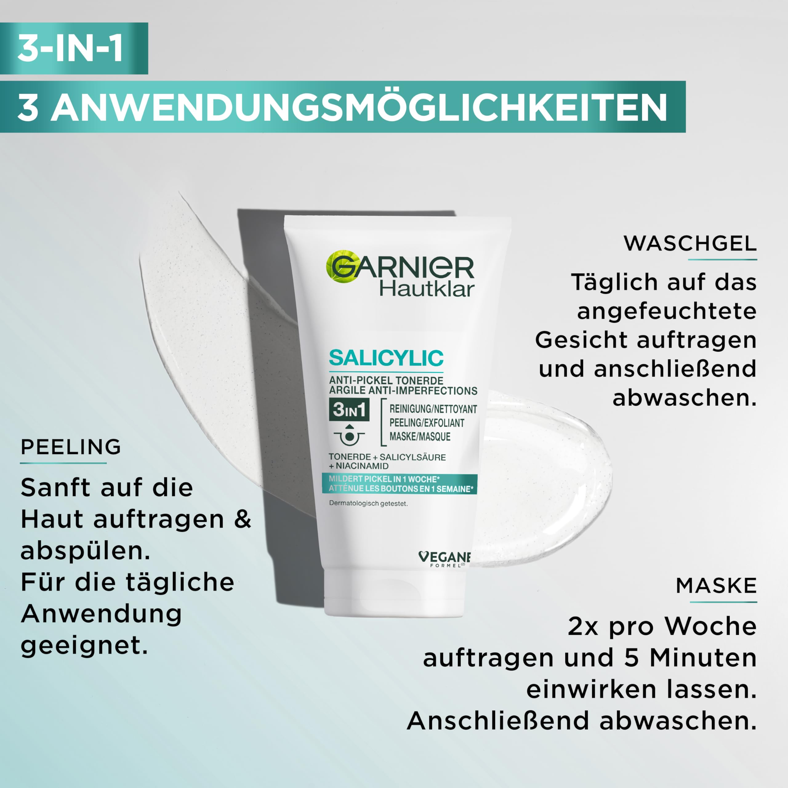 Garnier Hautklar 3-in-1 Gesichtsreinigung – Reinigung, Peeling & Maske mit Salicylsaeure & Tonerde fuer unreine Haut (150 ml)
