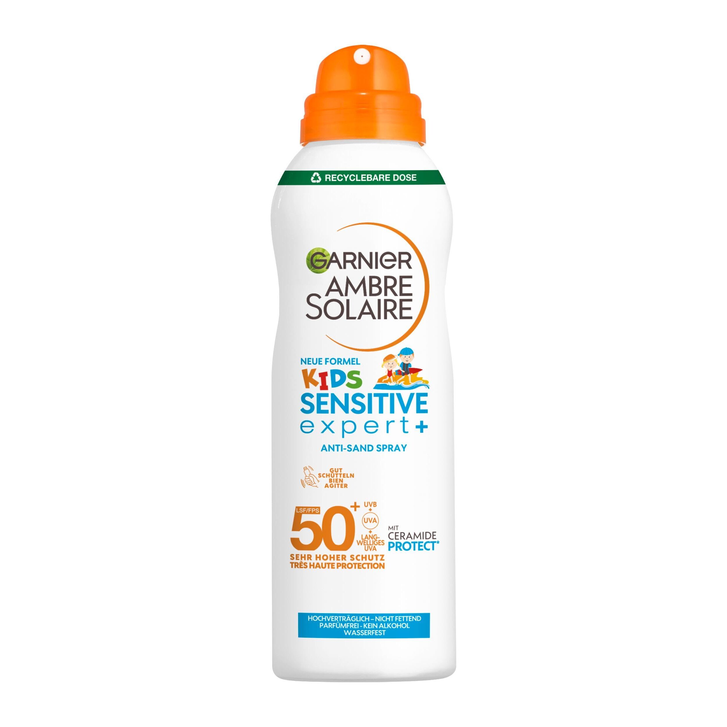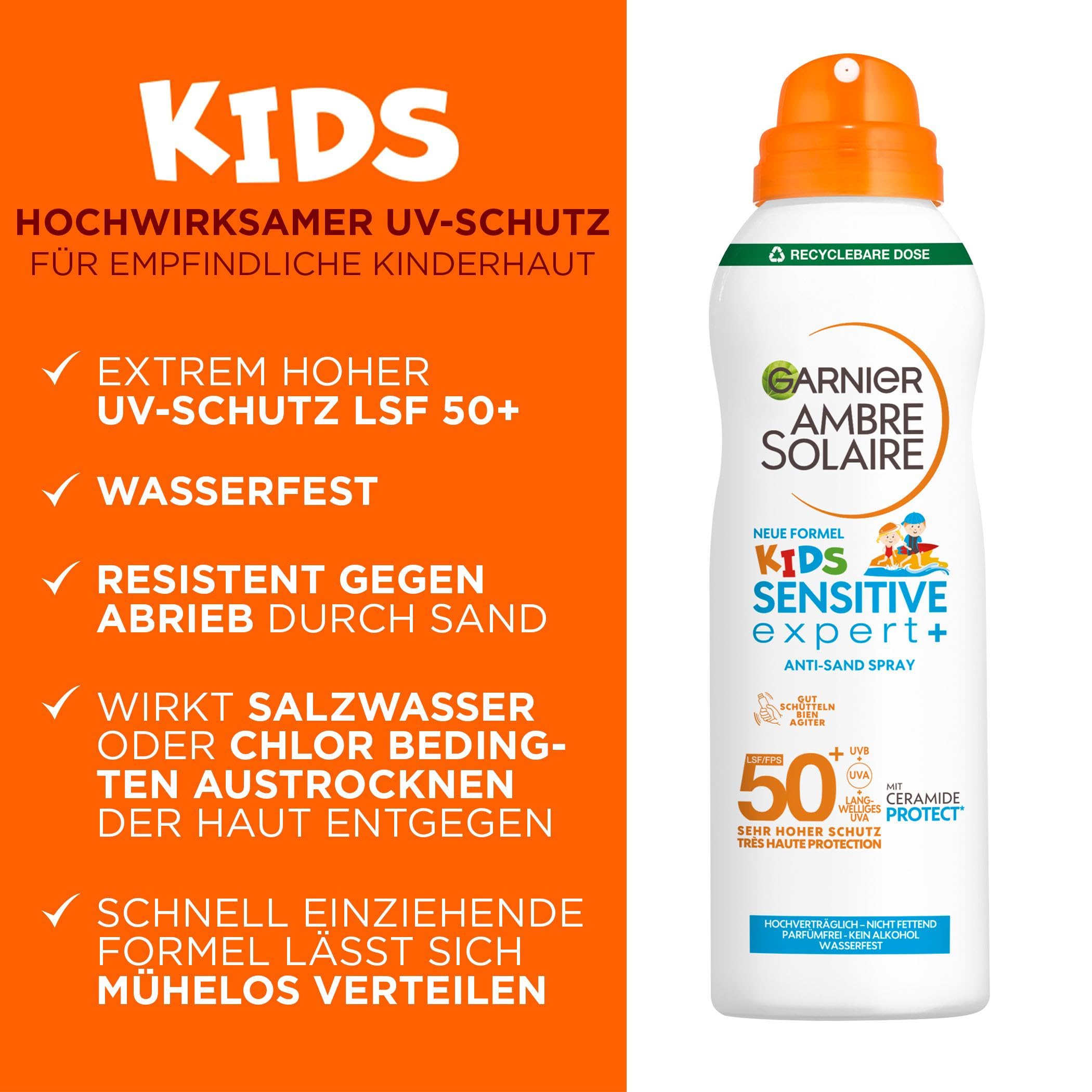 Garnier Sonnenspray LSF 50 für Kinder, Wasserfest und Sandabweisend, Ambre Solaire Kids Sensitive expert+ Anti-Sand Spray LSF 50+, 1 x 150 ml