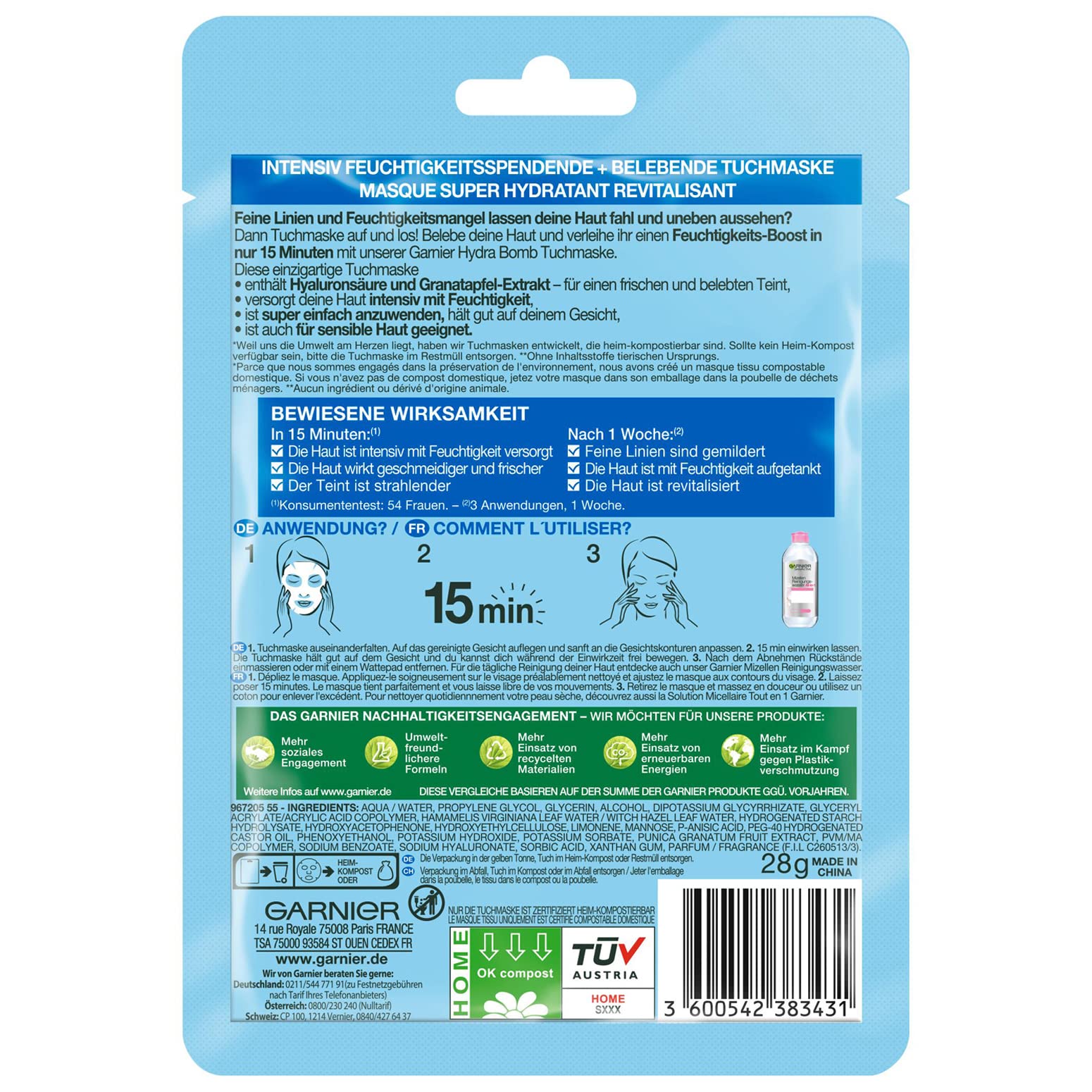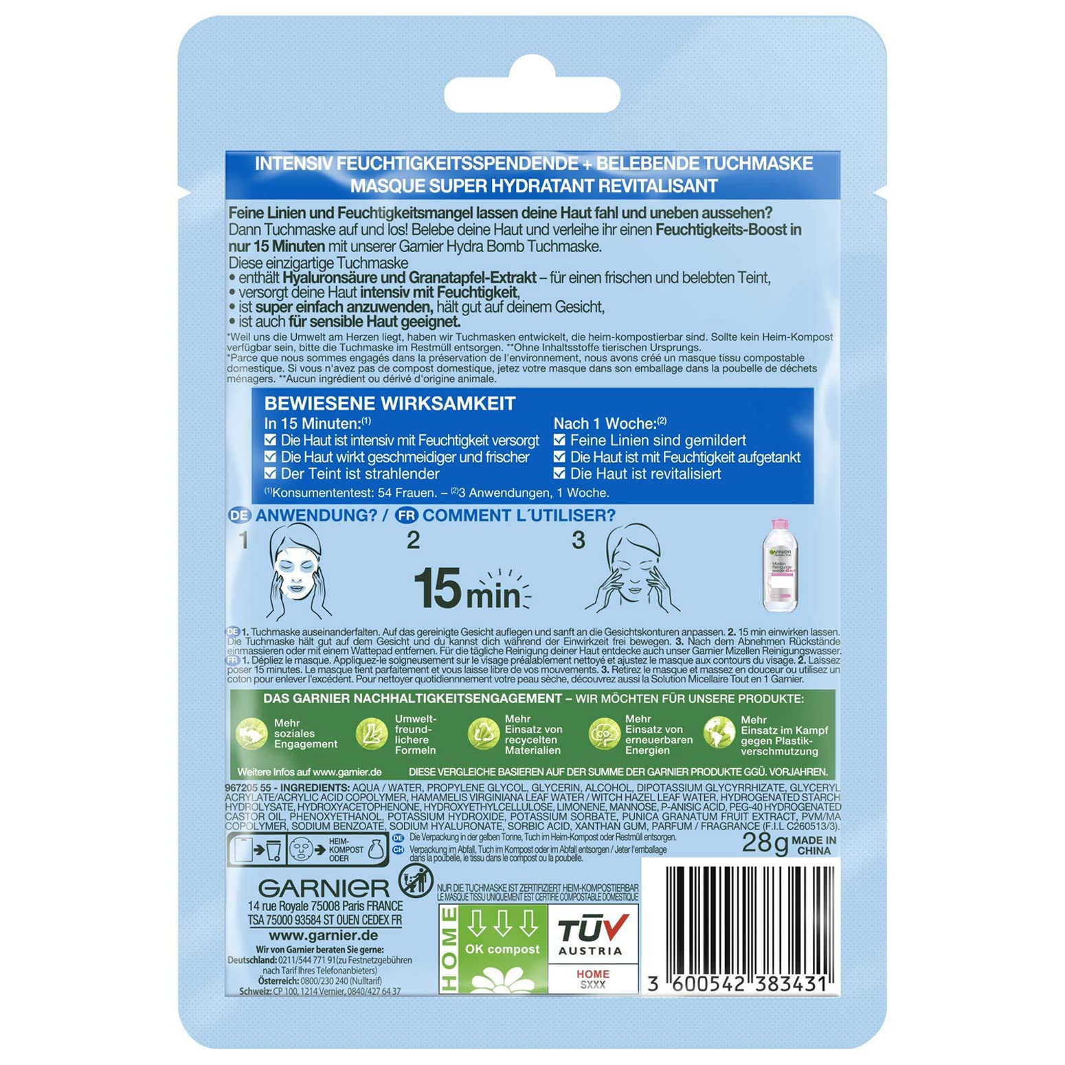 Die Garnier Hydra Bomb Nacht Tuchmaske ist eine wirkungsvolle Overnight Pflege, die speziell entwickelt wurde, um muede, empfindliche oder feuchtigkeitsarme Haut tiefenwirksam zu regenerieren und mit Feuchtigkeit zu versorgen, waehrend du schläfst. Die reichhaltige Kombination aus Hyaluronsaeure, Tiefesswasser und Kornblumenextrakt sorgt fuer intensive Hydration, Beruhigung und ein erfrischtes Hautgefuehl am Morgen.