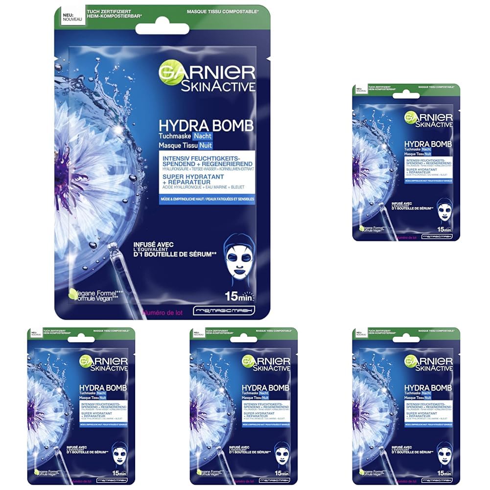 Garnier Hydra Bomb Nacht Tuchmaske – Regenerierende Overnight Gesichtsmaske mit Hyaluronsaeure fuer muede & empfindliche Haut (28 g)