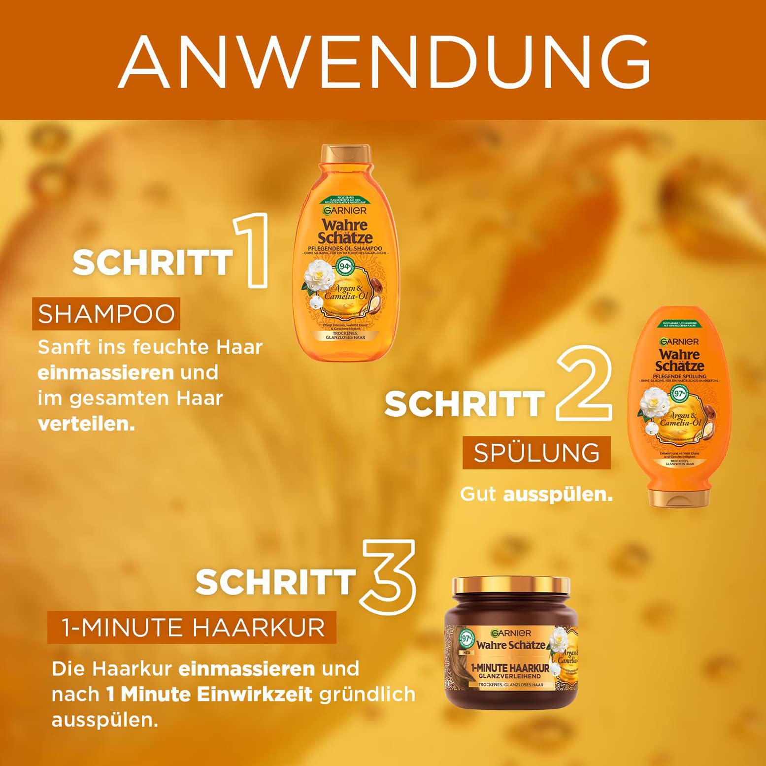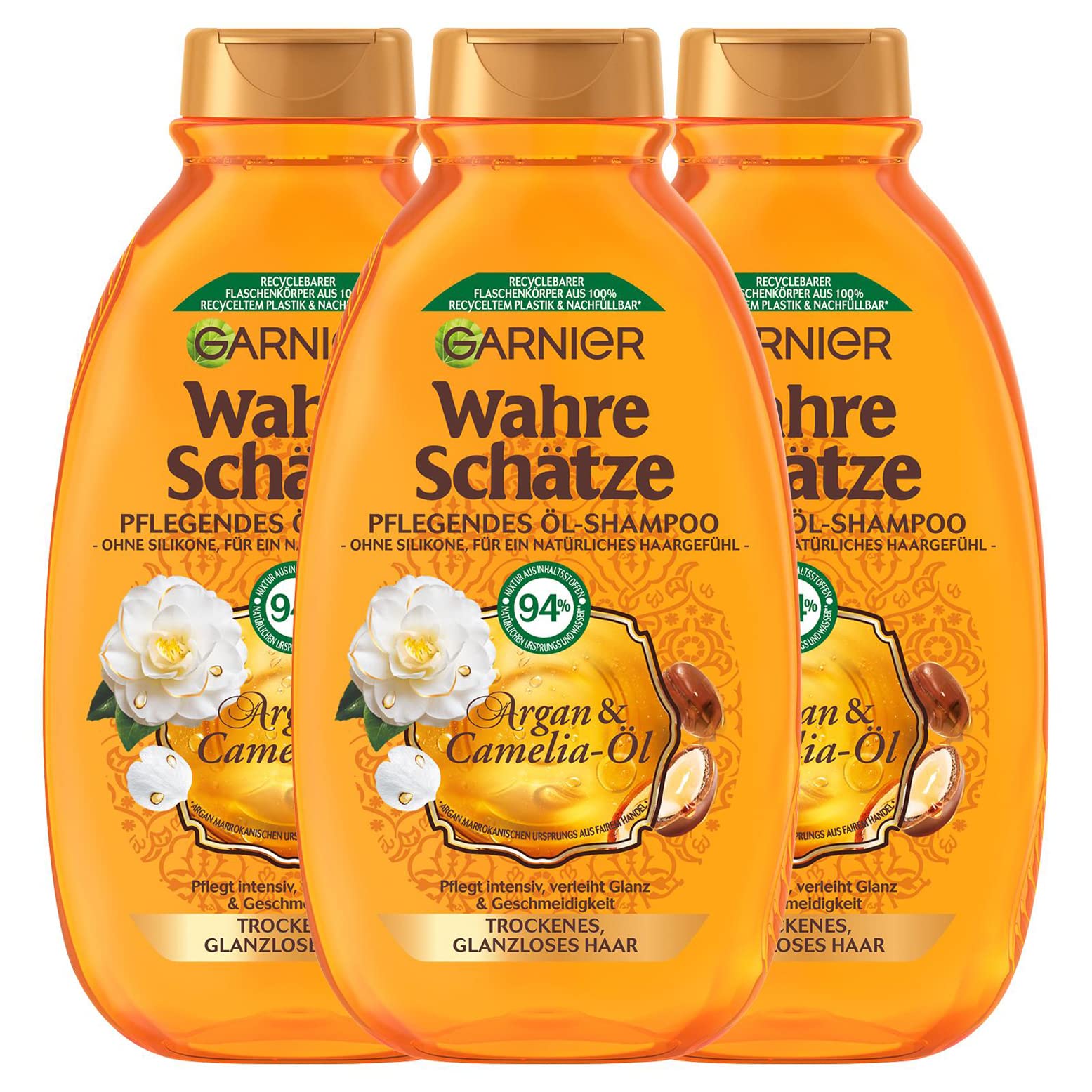 Garnier Wahre Schätze Pflegendes Öl-Shampoo Argan- & Camelia-Öl, pflegt intensiv, verleicht Glanz und Geschmeidigkeit, 3 x 250 ml