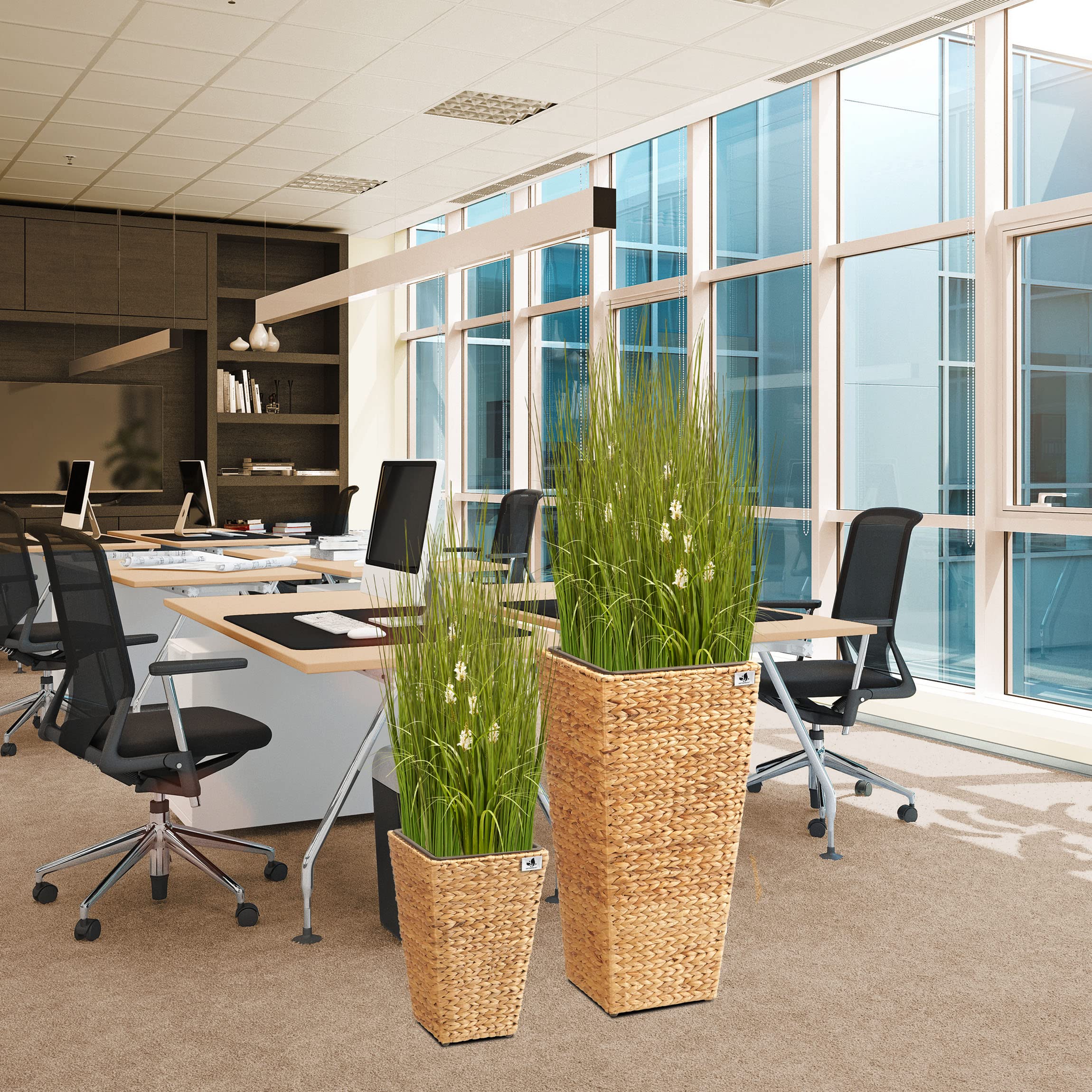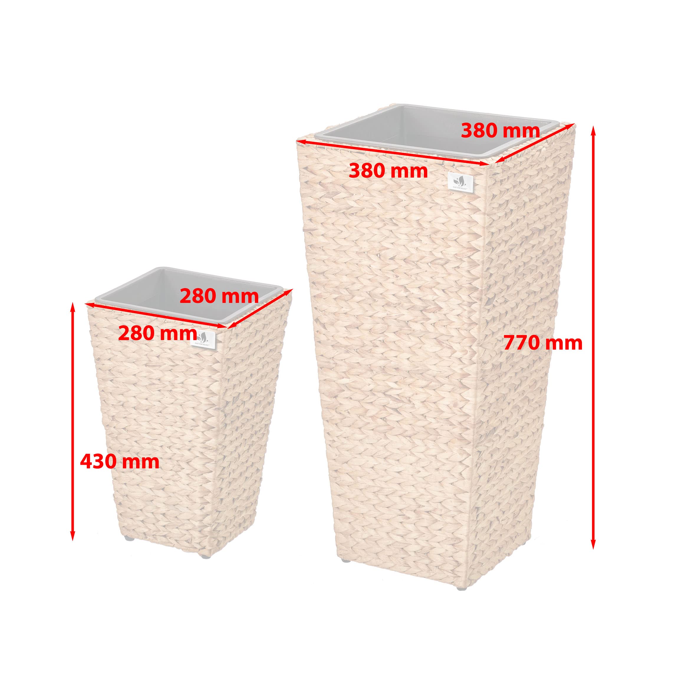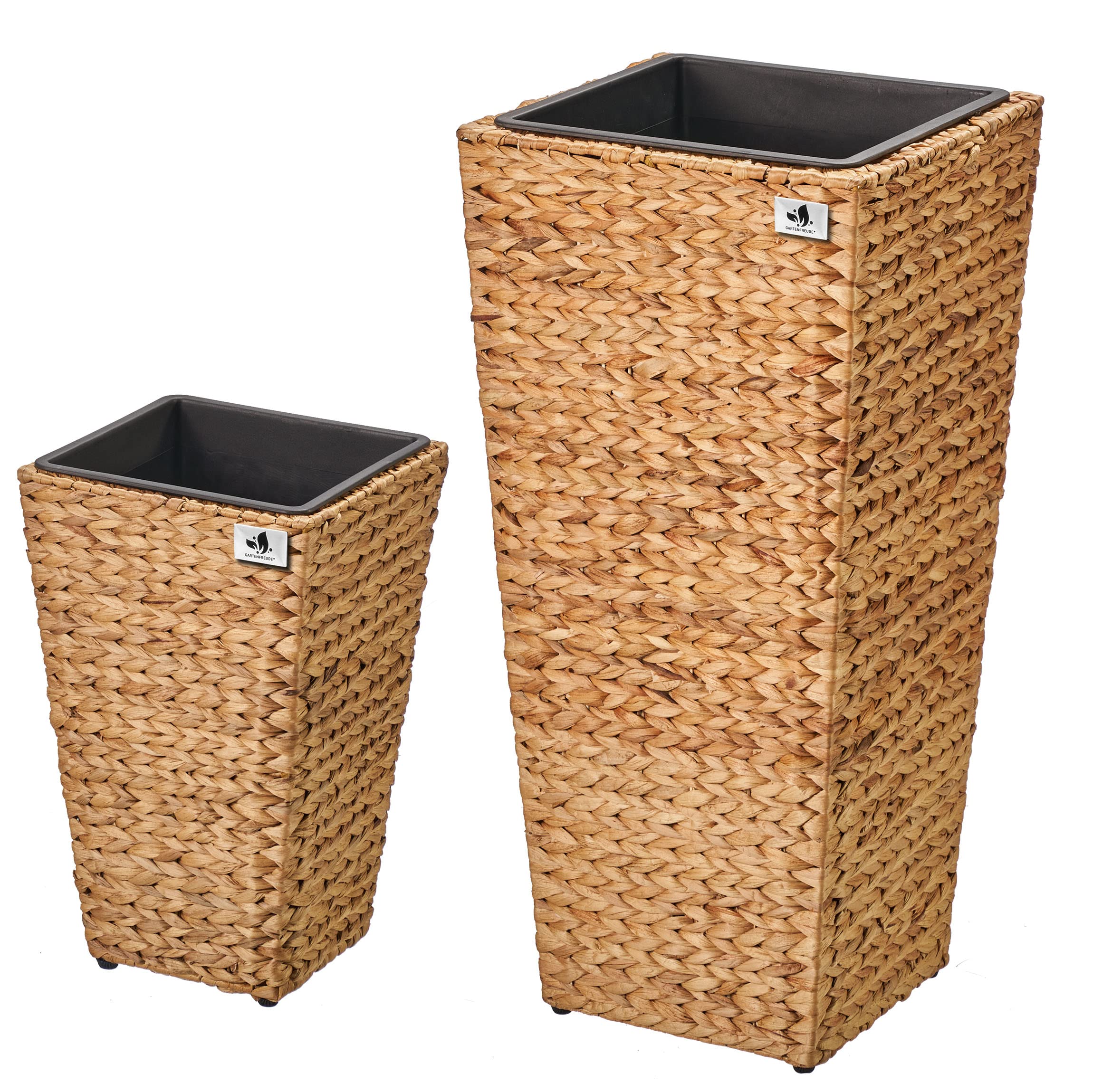 Pflanzgefäss mit Wasserhyazinthengeflecht 2er Set, 38 x 38 x 77cm, 28 x 28 x 43cm. Das Gartenfreude Pflanzgefäss Wasserhyazinthe setzt dekorative Akzente im Innen- oder im geschützten Aussenbereich. Das Set ist hochwertig aus geflochtener Wasserhyazinthe gefertigt, das ein natürliches und nachhaltiges Material ist und mit dem Sie ein mediterranes Gefühl in Ihre Umgebung zaubern. Der innere Rahmen besteht aus stabilem Metall. Der Kunststoffeinsatz kann bequem ausserhalb des Gefässes bepflanzt und dann eingesetzt werden und bietet ausreichend Platz. Gegenüber Einsätzen aus anderen Materialien bietet dieser den Vorteil, nicht zu rosten und absolut wasserdicht zu sein.