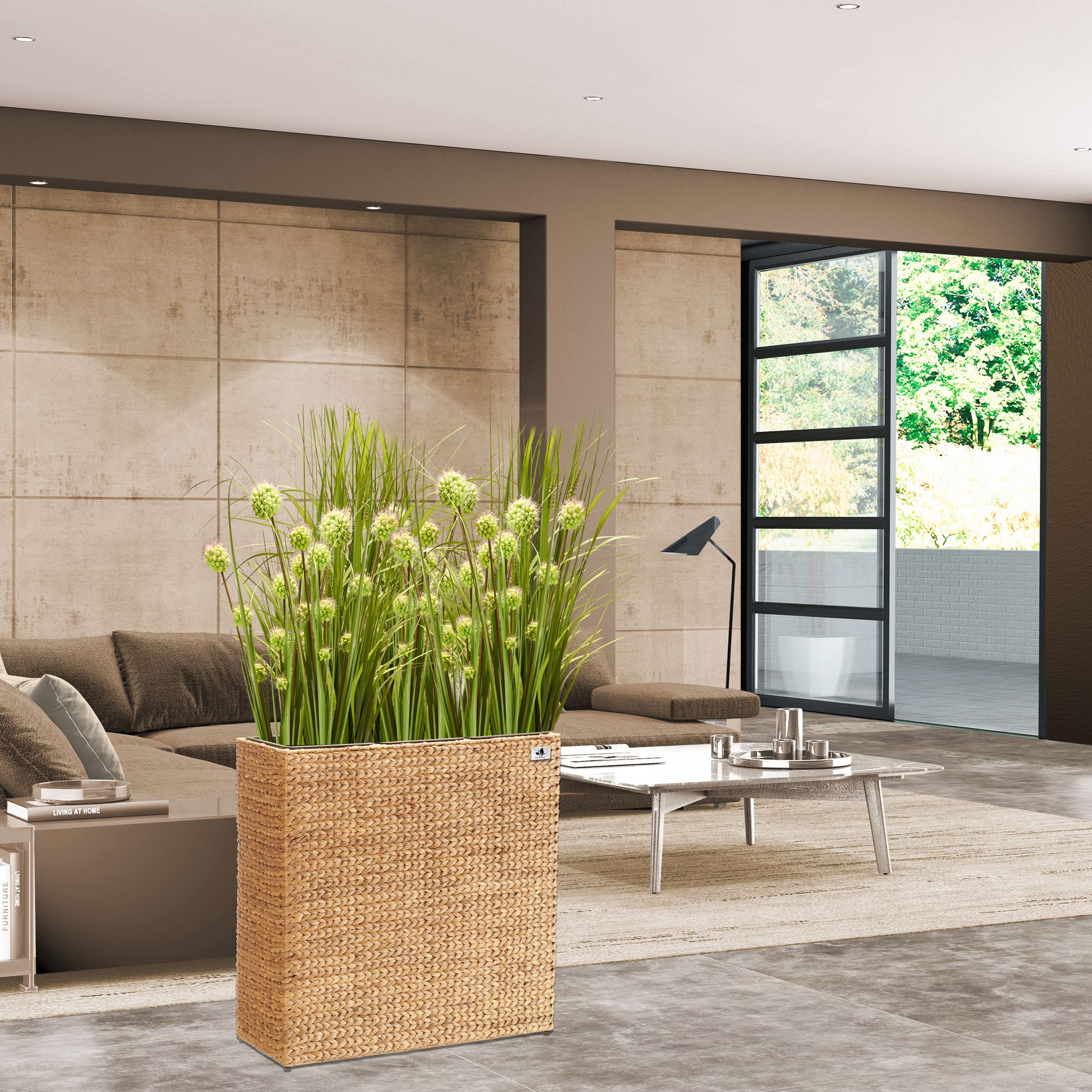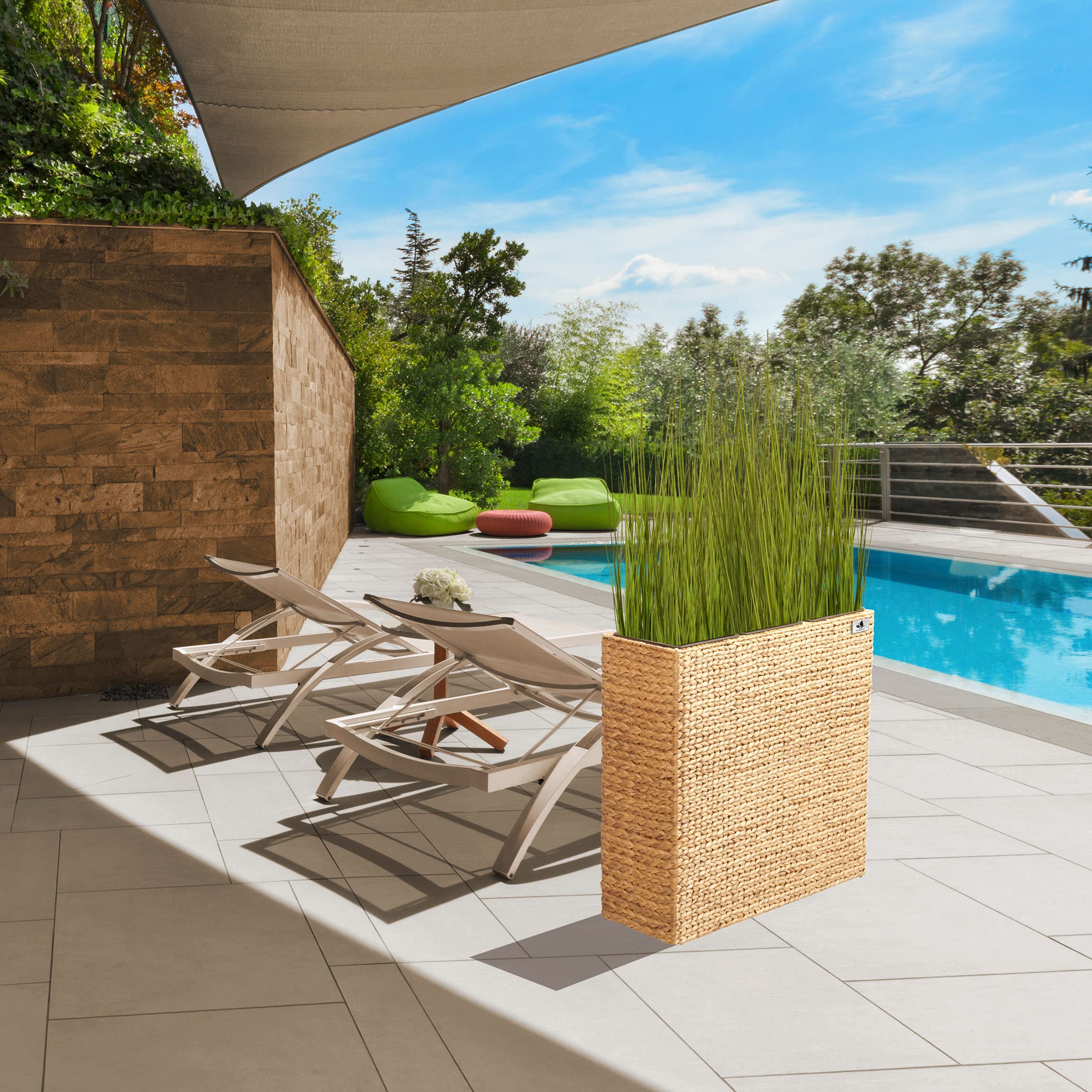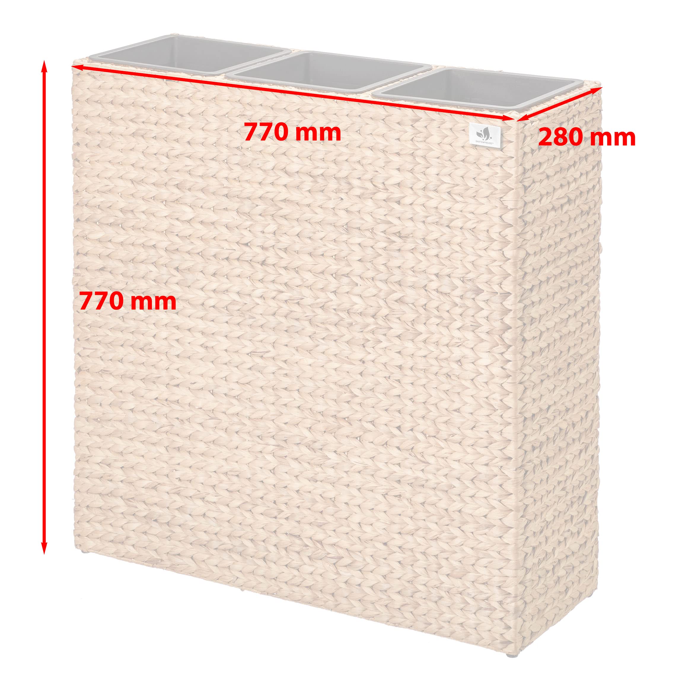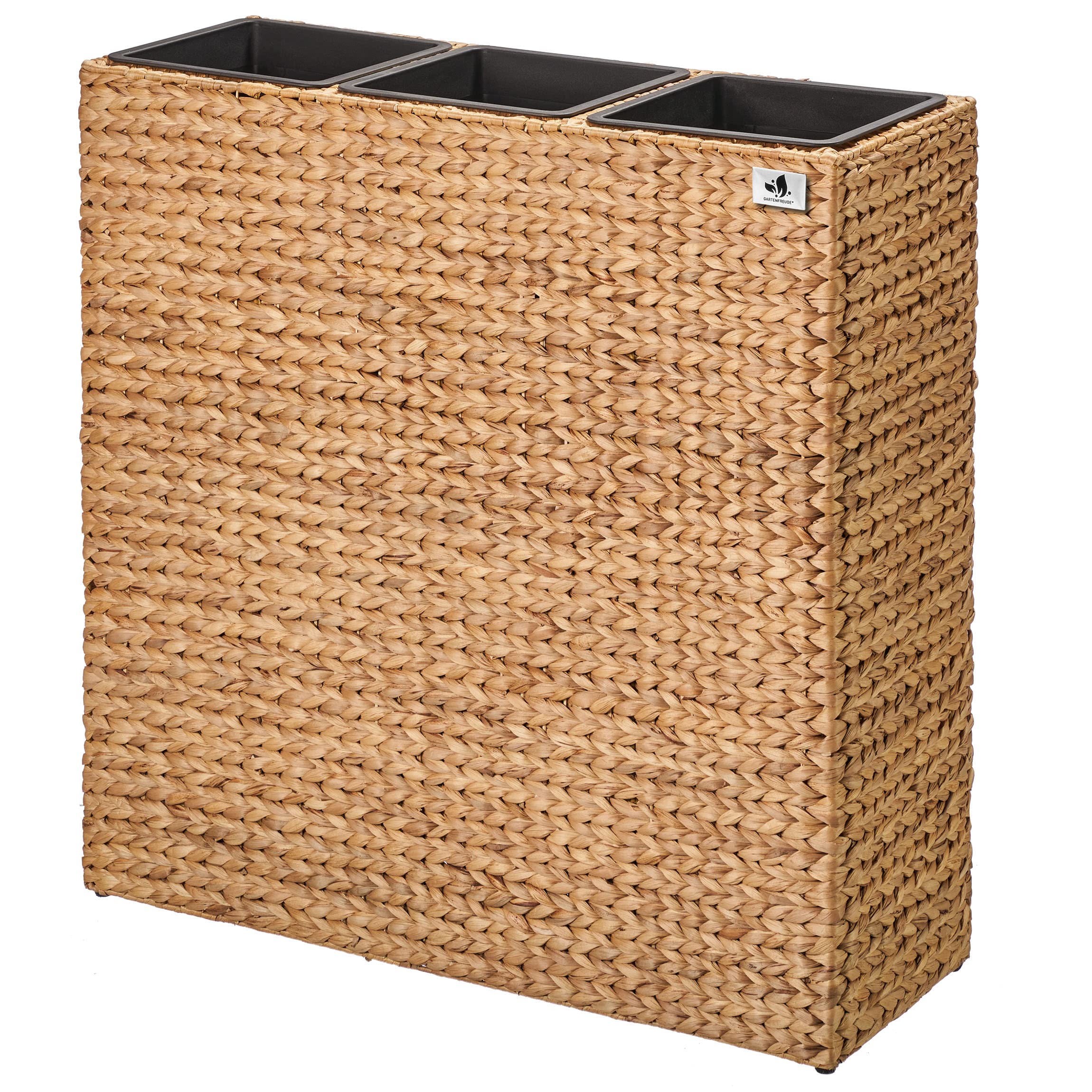 Das Gartenfreude Pflanzgefäss Wasserhyazinthe setzt dekorative Akzente im Innen- oder im geschützten Aussenbereich. Das Pflanzgefäss ist hochwertig aus geflochtener Wasserhyazinthe gefertigt, das ein natürliches und nachhaltiges Material ist und mit dem Sie ein mediterranes Gefühl in Ihre Umgebung zaubern. Der innere Rahmen besteht aus stabilem Metall. Der Kunststoffeinsatz kann bequem ausserhalb des Gefässes bepflanzt und dann eingesetzt werden und bietet mit einer Grösse von 77 x 28 x 28 cm cm ausreichend Platz. Gegenüber Einsätzen aus anderen Materialien bietet dieser den Vorteil, nicht zu rosten und absolut wasserdicht zu sein.