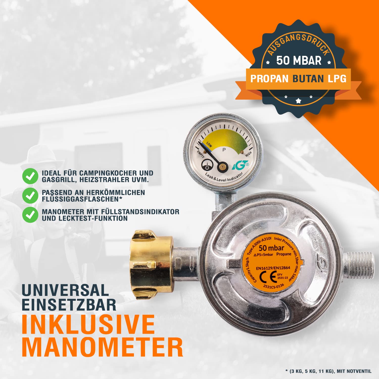- Passend an herkömmlichen Flüssiggasflaschen (3 kg, 5 kg, 11 kg). Eingangsdruck: Flaschendruck (ungeregelt)/ Ausgangsdruck: 50mbar Leistung: Bis maximal 1,5 Kg/h