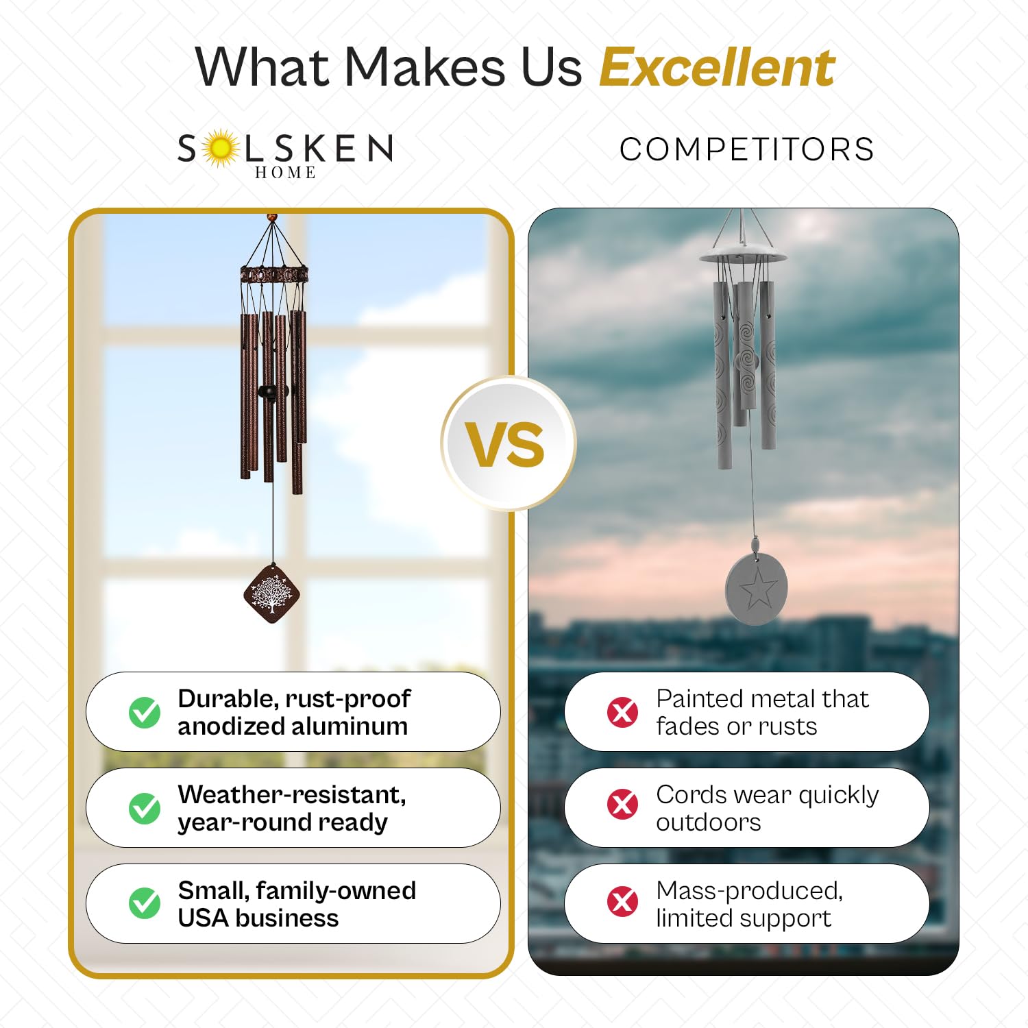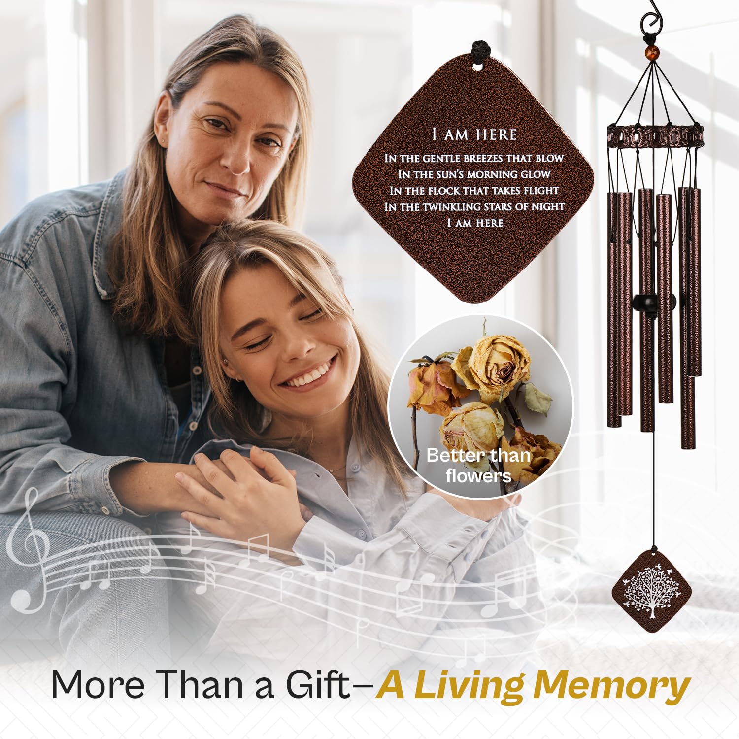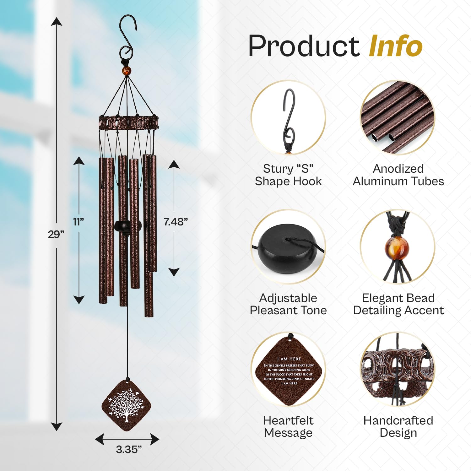 Diese Beileids-Windspiele sind für jeden konzipiert, der in Trauer ist – egal, ob Sie nach einem Beileidsgeschenk für die Familie, einem herzlichen Andenken für den Verlust von Eltern oder einem beruhigenden Trauergeschenk suchen. Sechs präzise abgestimmte Aluminiumrohre in warmer Bronze lassen tiefe und doch süsse Klänge erklingen, die wie eine geflüsterte Umarmung durch die Luft wirbeln und jede Veranda oder jeden Garten in einen heilenden Zufluchtsort verwandeln. Das Segel trägt das schöne Gedicht „I Am Here“ und wird von einem eleganten Baum des Lebens eingerahmt – ein Emblem der ungebrochenen Verbindung zwischen Himmel und Erde, das über verschiedenste Kulturen hinweg widerhallt. Dieses durchdachte Kunstwerk macht die Gedenkwindspiele gleichermassen bedeutungsvoll als Gedenkgeschenk für Sie oder ihn, für Ehepartner, Geschwister oder enge Freunde. Jedes Detail zeugt von Andenken: Gedenk-Windspiel: Handgestimmt für eine glatte, resonante Stimme, die beruhigend wirkt. Wetterfeste Bronze-Oberfläche: Rostbeständige Rohre, strapazierfähige Nylonaufhängung und ein verstärkter S-Haken sorgen für jahrelangen Schutz auch in Aussenbereichen. Geschenkverpackung: Eine elegante Geschenkbox (33 x 12,7 x 5,1 cm) und eine universelle Beileidskarte mit Blumen, ermöglichen es Ihnen, vor dem Verschenken eine persönliche Note hinzuzufügen, falls Sie dies wünschen. Oder senden Sie dieses Windspiel-Gedenkgeschenk einfach direkt an die Trauerfeier als spontanes Zeichen von Sympathie und Liebe. Handwerkskunst für kleine Unternehmen: Diese Gedenk-Windspiele für den Verlust eines geliebten Menschen wurden mit Stolz in New Jersey entworfen und verantwortungsvoll von Kunsthandwerkern in Übersee gefertigt. Darüber hinaus werden sie von einem reaktionsschnellen Kundenservice-Team unterstützt, so dass Sie sich wohl dabei fühlen können, ein kleines, US-Familienunternehmen zu unterstützen. Egal, ob Sie ein individuelles Andenken für den Verlust einer Mutter, eines Vaters, eines Ehemanns, einer Ehefrau oder eines geliebten Geschwisterteils, Cousins oder Freundes benötigen, diese Windspiele für den Verlust eines geliebten Menschen bieten dauerhaften Trost und eine ständige Erinnerung daran, dass die Melodie der Liebe nie verblasst. Hängen Sie es auf, hören Sie sein Spiel und spüren Sie die Anwesenheit Ihrer Liebsten mit jedem dieser sanften Lieder. Jedes Detail zeugt von Andenken: Windspiel-Andenken: Handgestimmt für eine glatte, resonante Stimme, die beruhigend wirkt.