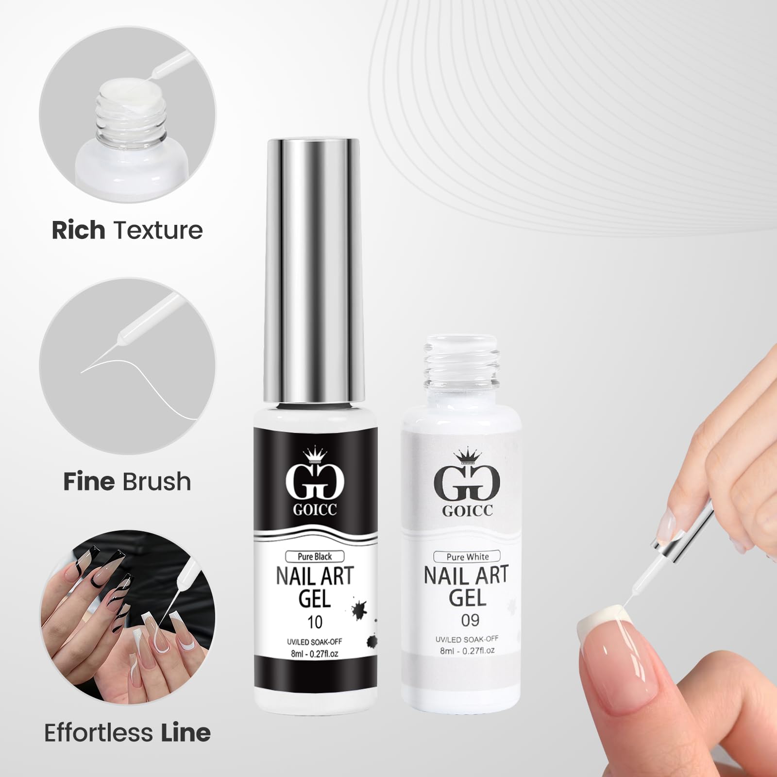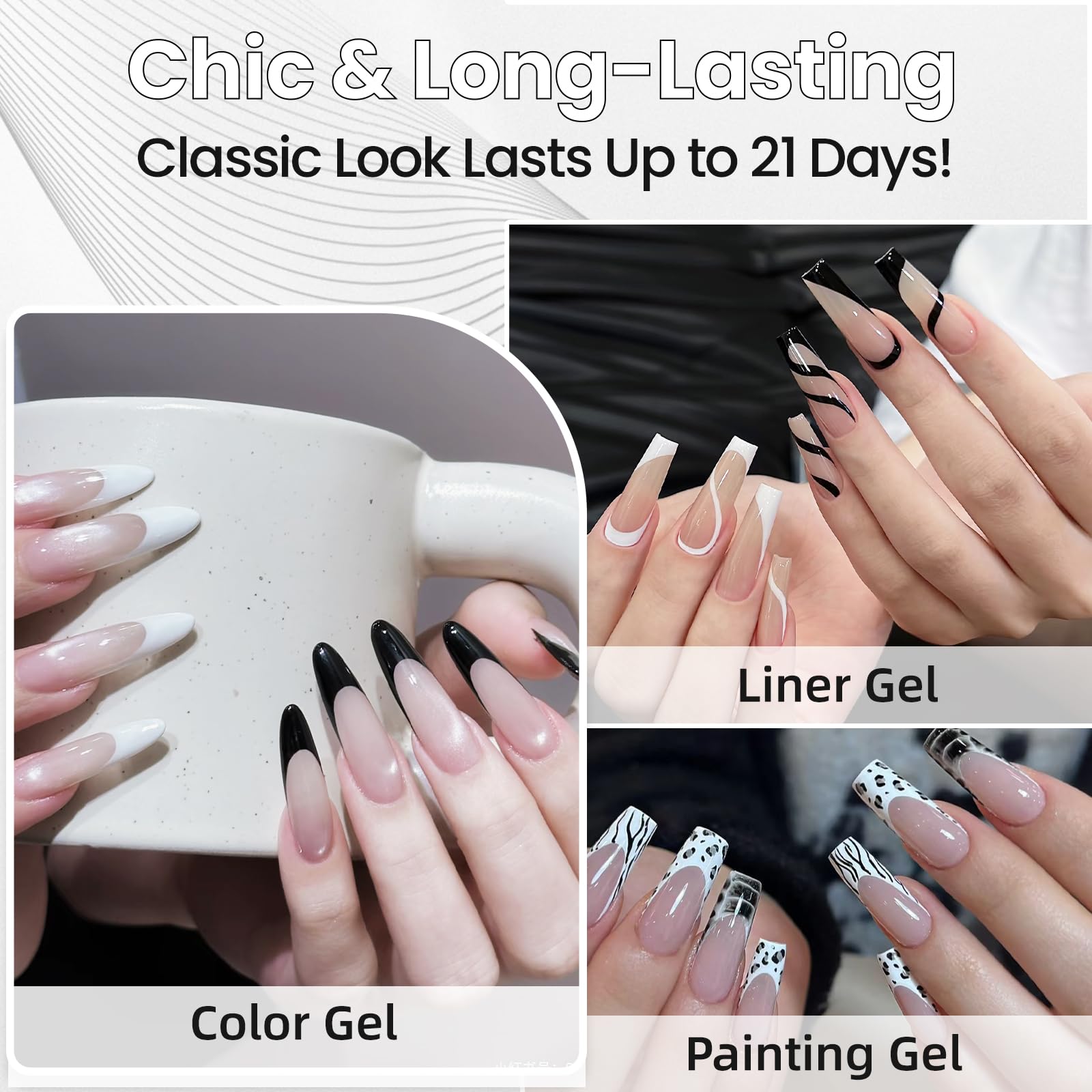 Dieser metallische UV Gel Nagellack in Gold und Silber eignet sich fuer praezise Nail Art Designs, French Manikueren und dekorative Akzente mit Spiegeleffekt. Er richtet sich an Anfaengerinnen und Profis, die feine Linien, 3D-Effekte oder vollflaechige Metallic-Looks umsetzen moechten.